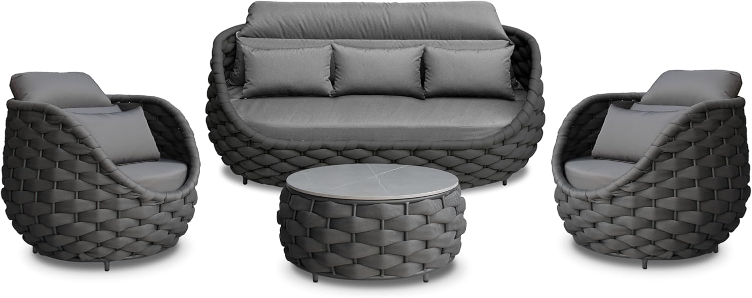 - Furniture set is crafted from reinforced rust-free aluminum alloy frame, wrapped in hand woven polyester rope. The 4 pieces all weather patio upholstered conversation set resists to UV, rain, wind, salt water. Perfect for indoor outdoor even arid or coastal areas