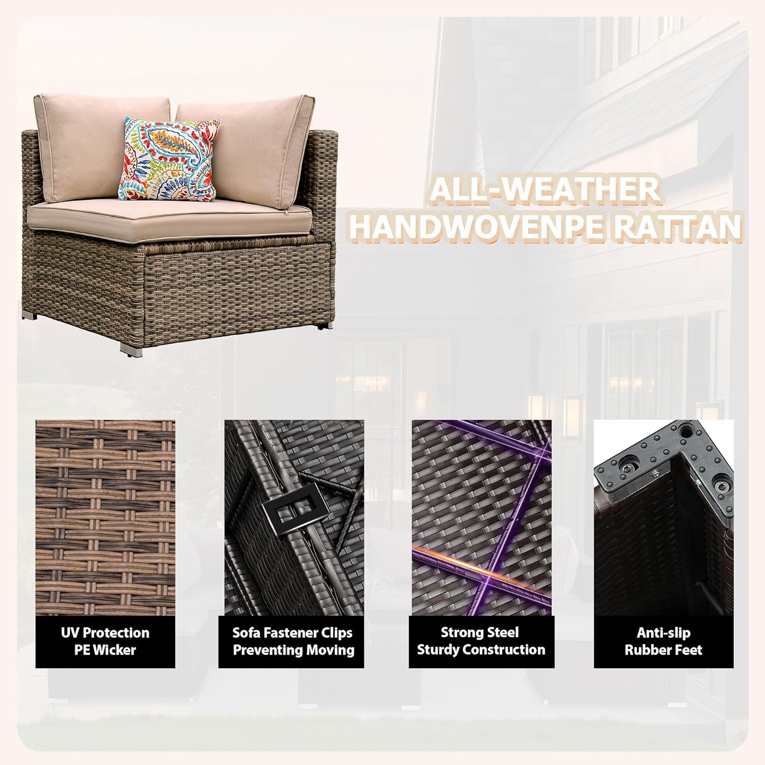- Durable All-Weather Material Crafted with hand-woven brown PE rattan and a strong steel frame, this sectional conversation sofa is highly durable to withstand rain, wind, and long-term outdoor use