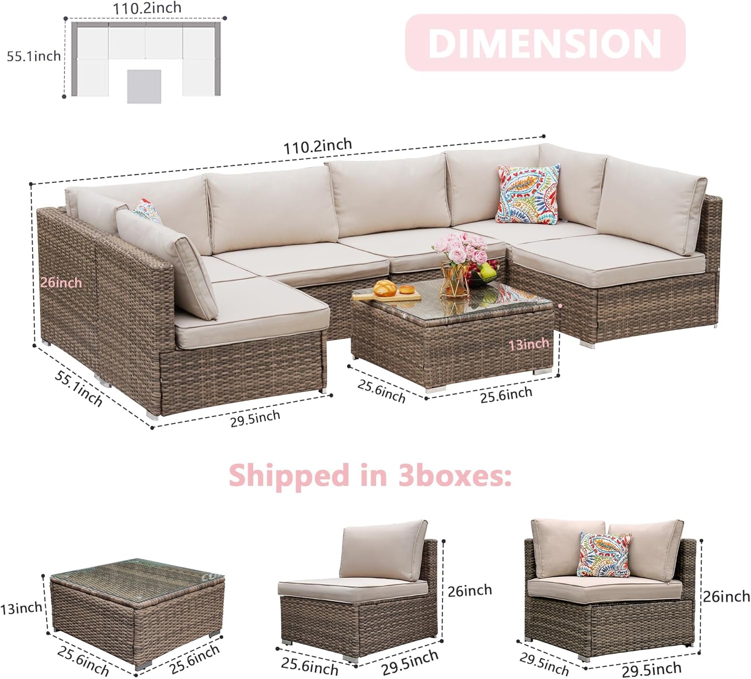 - Practical Packaging & Assembly The 7 pieces patio furniture sets are shipped in 3 separate boxes (may arrive on different days). Includes an instructional and all tools for easy setup