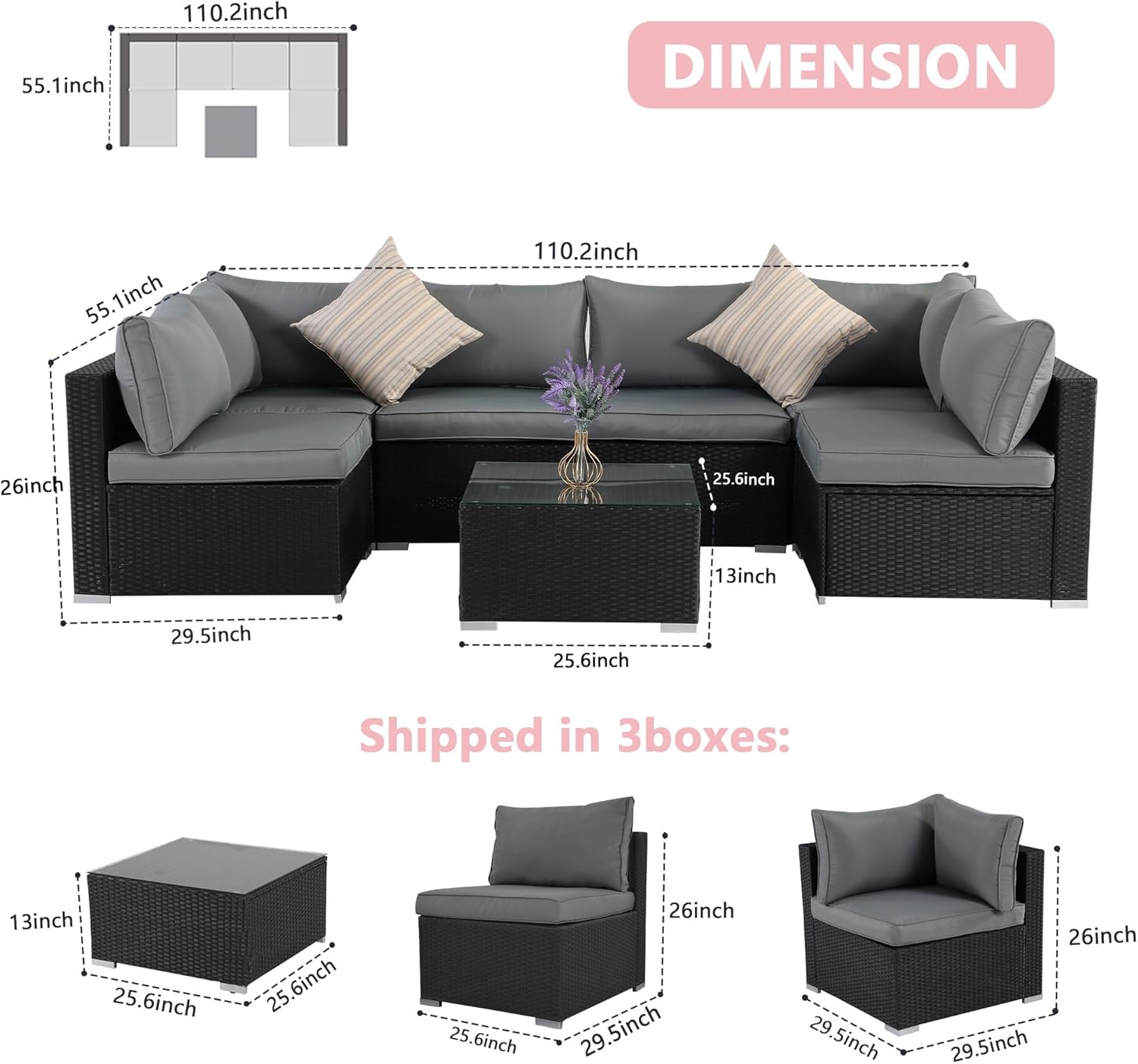 7-Piece Patio Furniture Set - Outdoor Sectional Sofa Set with Cushions and Glass-Top Coffee Table for Gardens, Poolside, Backyards and Porches, Black/Grey