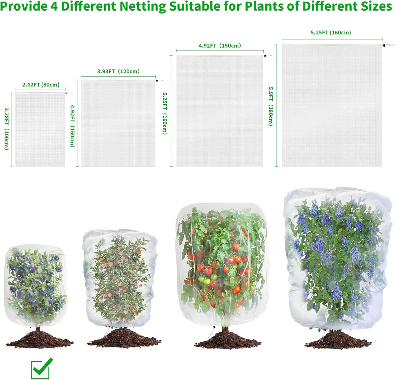 - Protect Your Harvest: Worry no more about wasted fruit with our bird netting! Effortlessly safeguard blueberry bushes, grapes, tomatoes, lemons, strawberries, oranges, and other fruit trees, vegetables, and shrubs from pesky insect, cicada, and bird damage.