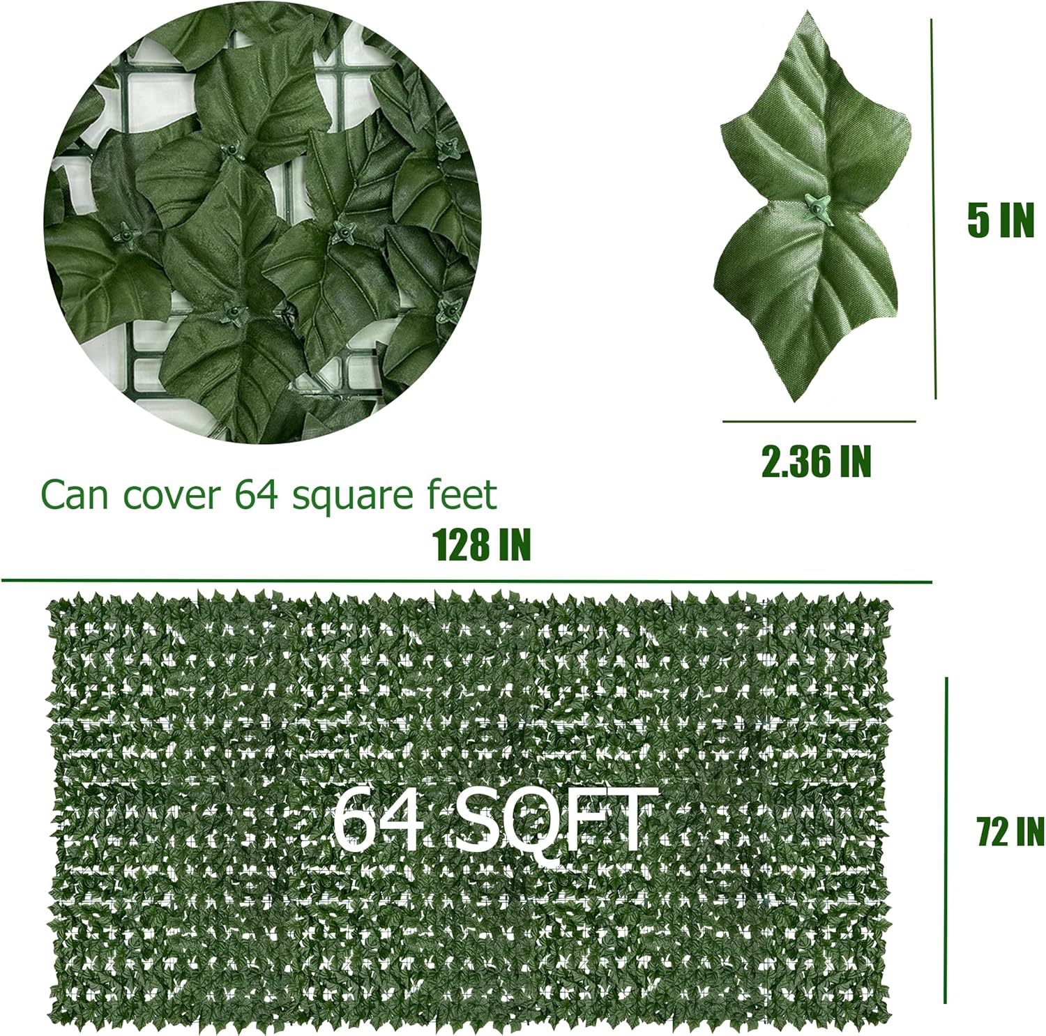 - Easy installation: the size of the artificial ivy grass wall panels is 72"×128" , Can cover 64 square feet.which can be cut into any shape and size you want, and each panel is equipped with interlocking connectors for easy and simple connection. Install it in your room or fence with adhesive tape or our attached cable ties.