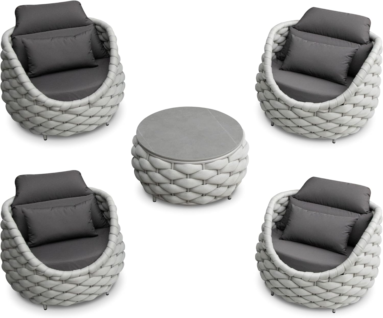 - Woven rope patio set includes: 4*sofa armchairs, 1*coffee table. Size: Single sofa: 34.3''(L)X34.3''(W)X27.6''(H) holds up to 400 lbs/181.5kg; Side table: 28.4''(L)X28.4''(W)X14.2''(H) holds up to 176 lbs/80kg. Color: Gray rope and dark gray fabric