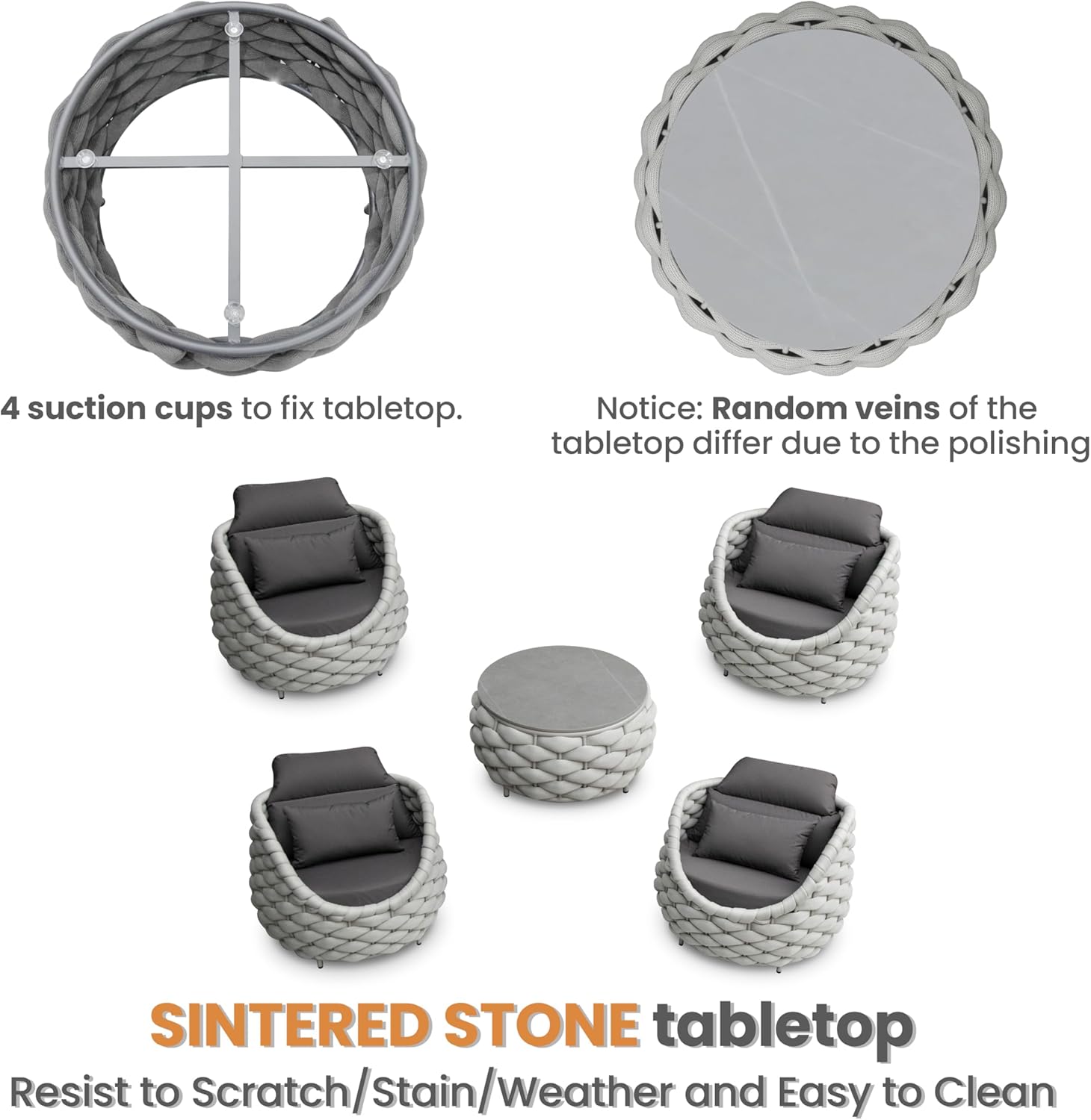 - Easy cleaning and scratch-resistant sintered stone tabletop is fixed by 4 suction cups. Cushions cover replaceable removal and machine washable. Adjustable nylon feet levelers for uneven floor also prevent scratching