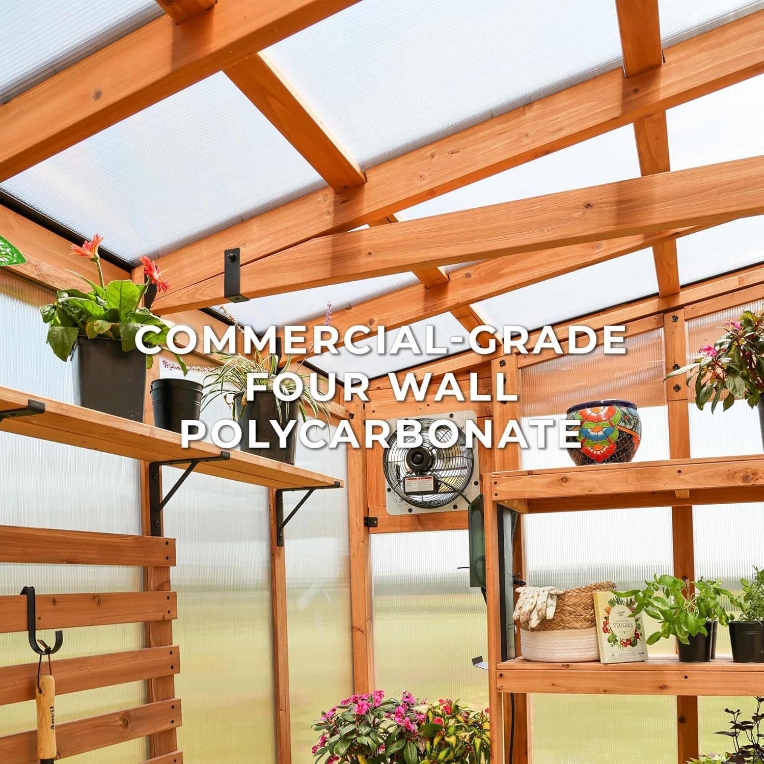 Backyard Discovery Poppy 11' x 7' Cedar Wood and Polycarbonate Walk-In Greenhouse Kit with Exhaust Fan, Windows, Hose Hook-Ups, PowerPort, Staging Shelves, Plant Hooks for Year-Round Outdoor Gardening