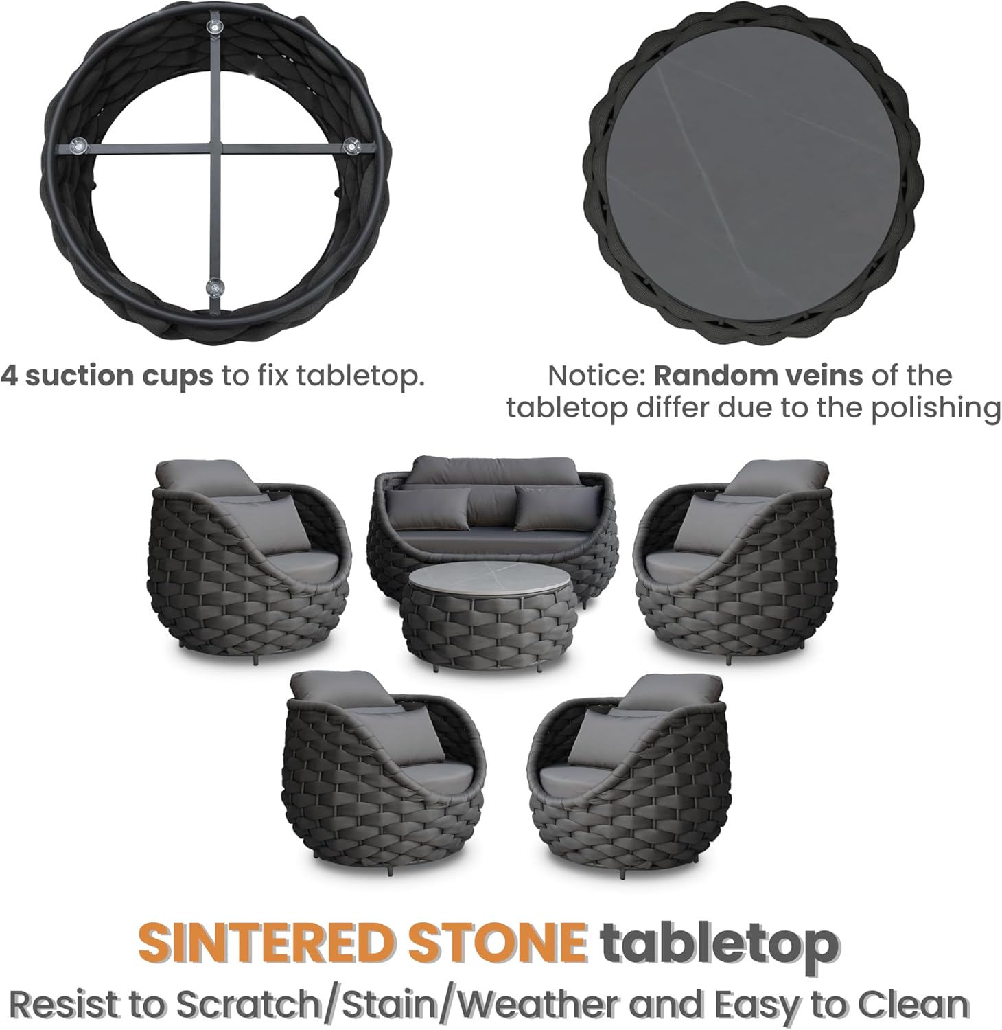 - Easy cleaning and scratch-resistant sintered stone tabletop is fixed by 4 suction cups. Cushions cover replaceable removal and machine washable. Adjustable nylon feet levelers for uneven floor also prevent scratching