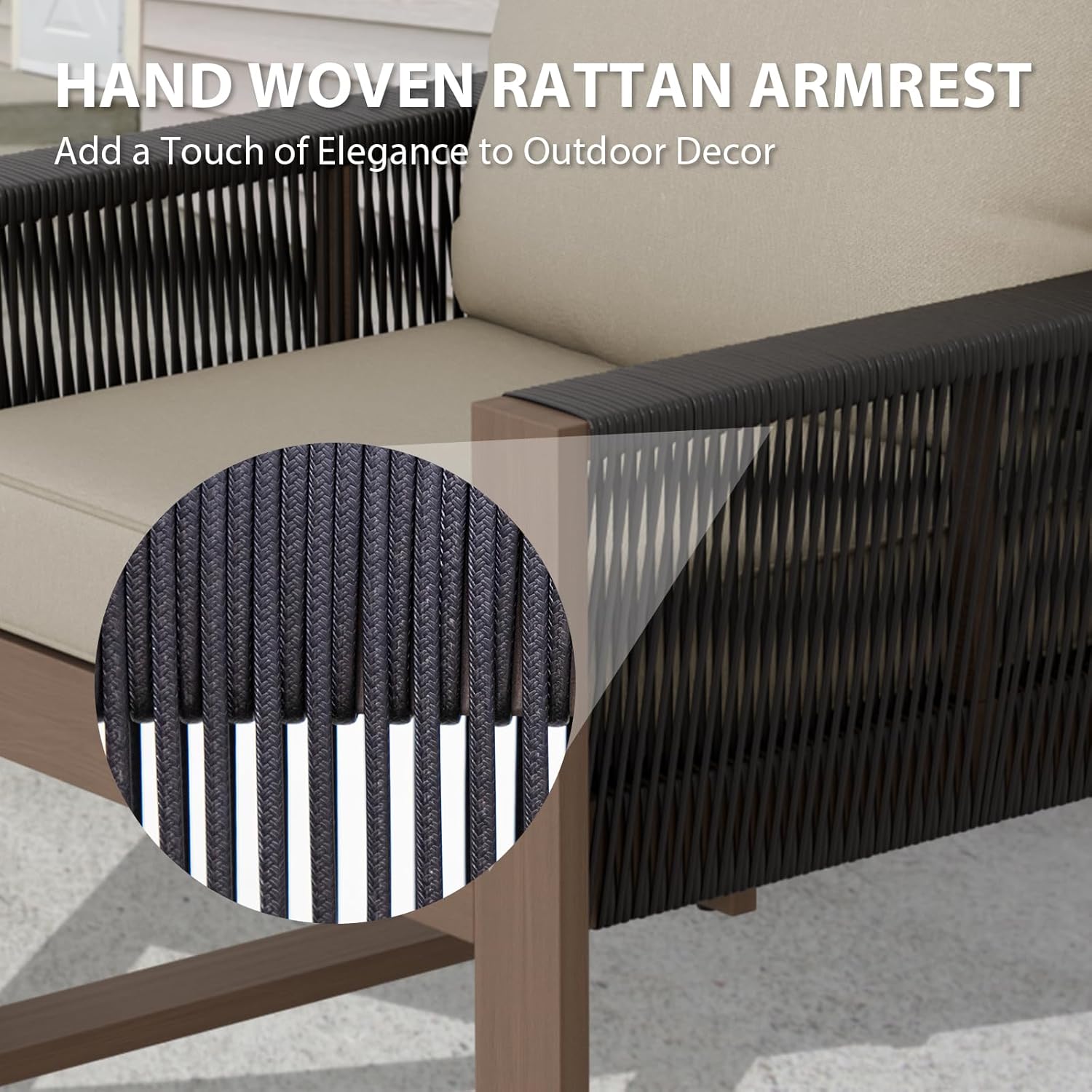 - VERSATILE USE: This conversation set includes a 3 seat sofa, 2 patio chairs, coffee table and a small sqaure side table. real wood tables are embossed to show the natural hues. It's outdoor weather resistant quality makes it ideal for patios, decks, porches, and poolside areas.