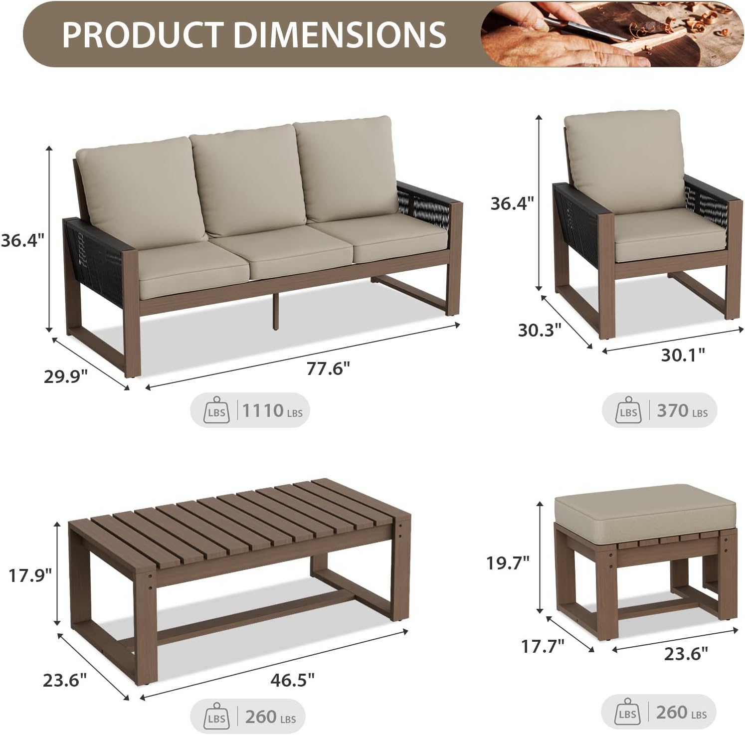 EAGLE PEAK Natural Wood Outdoor Patio Furniture, Cedar Furniture, Conversation Set, Outdoor Seating for Deck Patio Porch, Sofa 2 Chairs 2 Ottomans & Coffee Table, 6 Pieces, Brown/Beige