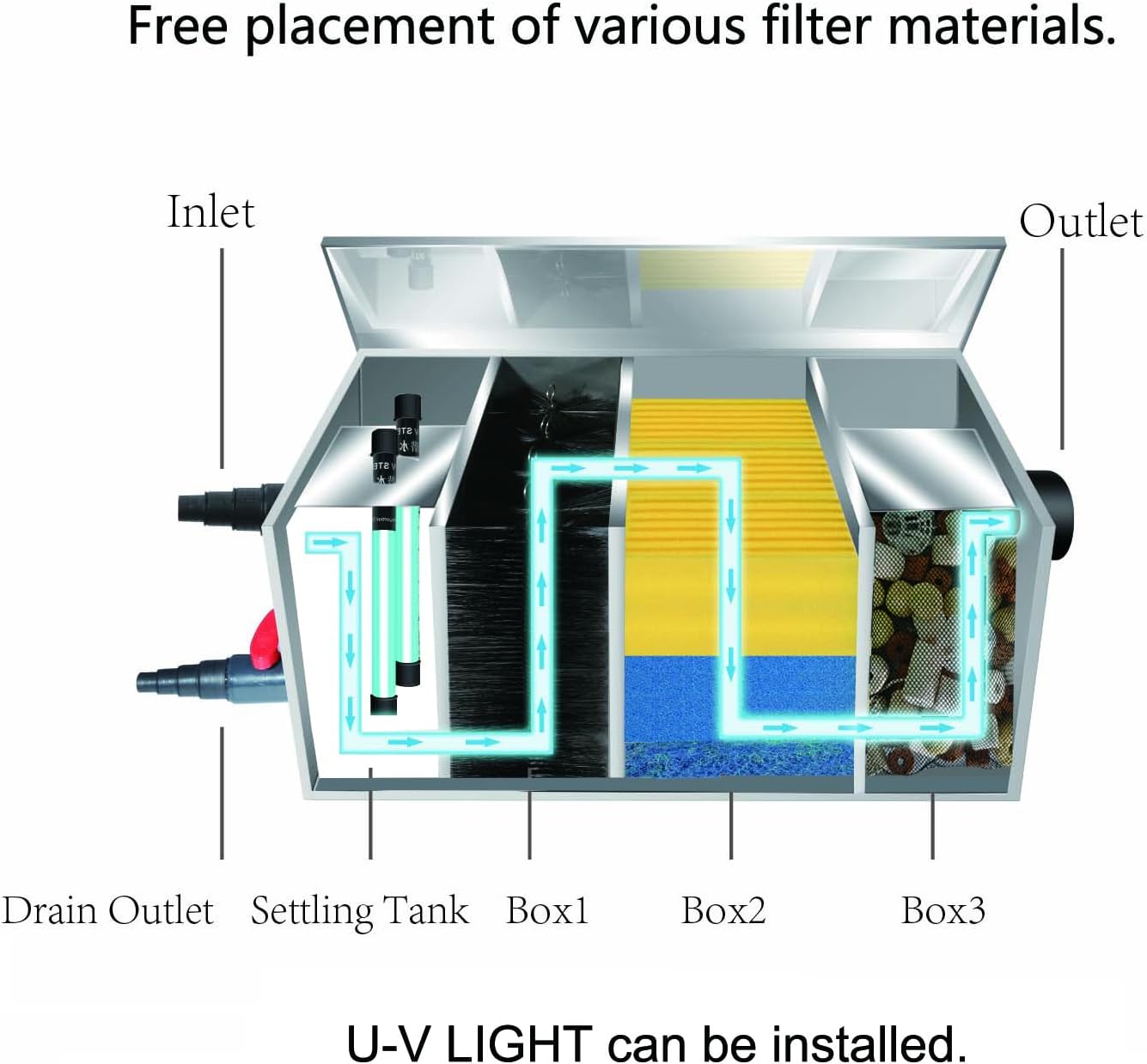 - Stainless Steel Box:long service life. Normal use will not be damaged.Not afraid of sun and rain.Suitable for decorative ponds 500~3000 Gallons.The specific volume of use is determined by the cleanliness of the fish pond water.