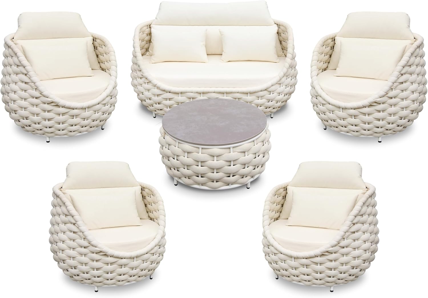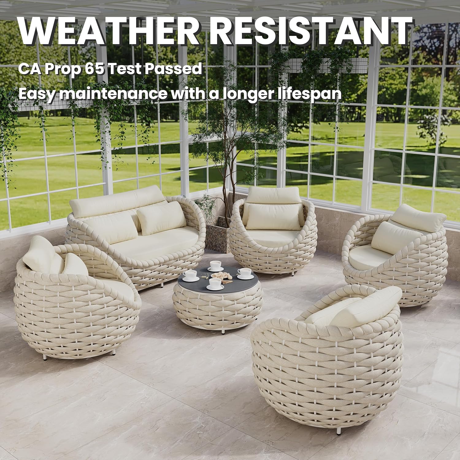 - Furniture set is crafted from reinforced rust-free aluminum alloy frame, wrapped in hand woven polyester rope. The 6 pieces all weather patio upholstered conversation set resists to UV, rain, wind, salt water. Perfect for indoor outdoor even arid or coastal areas