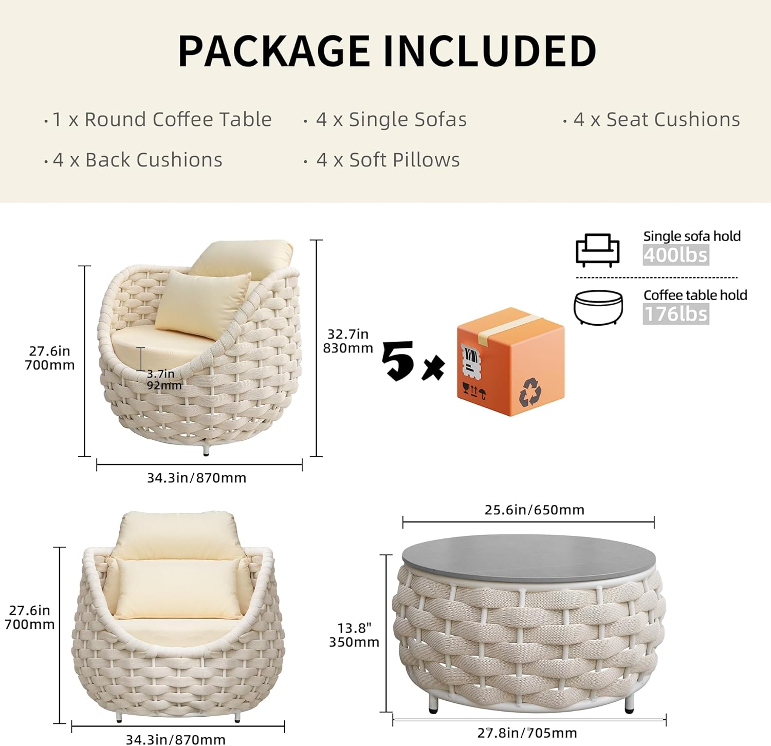 - Dimension,No Required Assembly - Single Chair: 34.3"(L) x 33"(W)x27.6 "(H);Round Table: 28"(W) x 13.8"(H).Outdoor sectional sofa can hold 400 lbs for each seating.Round coffee table can hold 176 lbs.Get your outdoor life refreshed with 5 piece aluminum patio furniture.