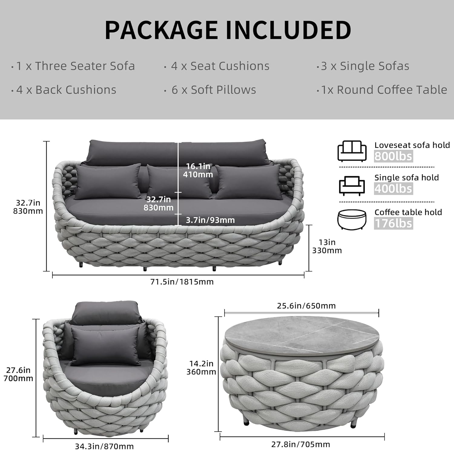 - Dimension,No Required Assembly - Three seater Sofa: 71.5"(L) x 33"(W) x 27.6"(H);Single Chair: 34.3"(L) x 33"(W)x27.6 "(H);Round Table: 28"(W) x 13.8"(H).Outdoor sectional sofa can hold 400 lbs for each seating.Round coffee table can hold 176 lbs.Get your outdoor life refreshed with 5 piece aluminum patio furniture.
