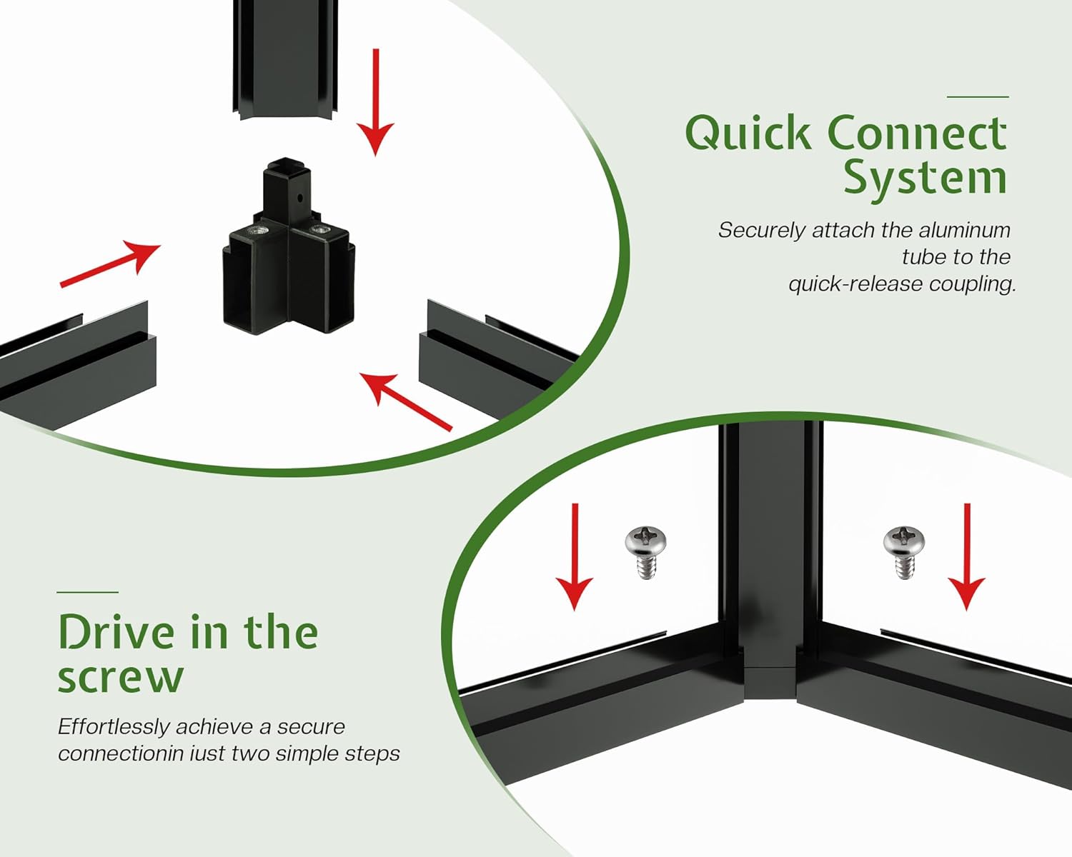 - Quick Connect System: This greenhouse kit can be assembled by three people in just 8 hours, thanks to the innovative Quick Connect technology. The easy-to-use push and locking screw system reduces setup time by 50%, ensuring a fast and secure connection