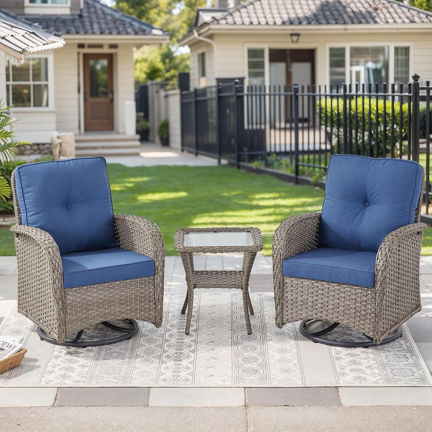- 360-Degree & Glider Swivel Patio Chairs: Relax in comfort with these outdoor swivel chairs that feature 360-degree rotation for easy movement. The ergonomic seat and backrest provide excellent support for long outdoor sessions. Enjoy a smooth back-and-forth glider motion, while the 3-inch armrests offer added comfort for your arms. Perfect for unwinding or socializing, these chairs enhance your outdoor experience with both comfort