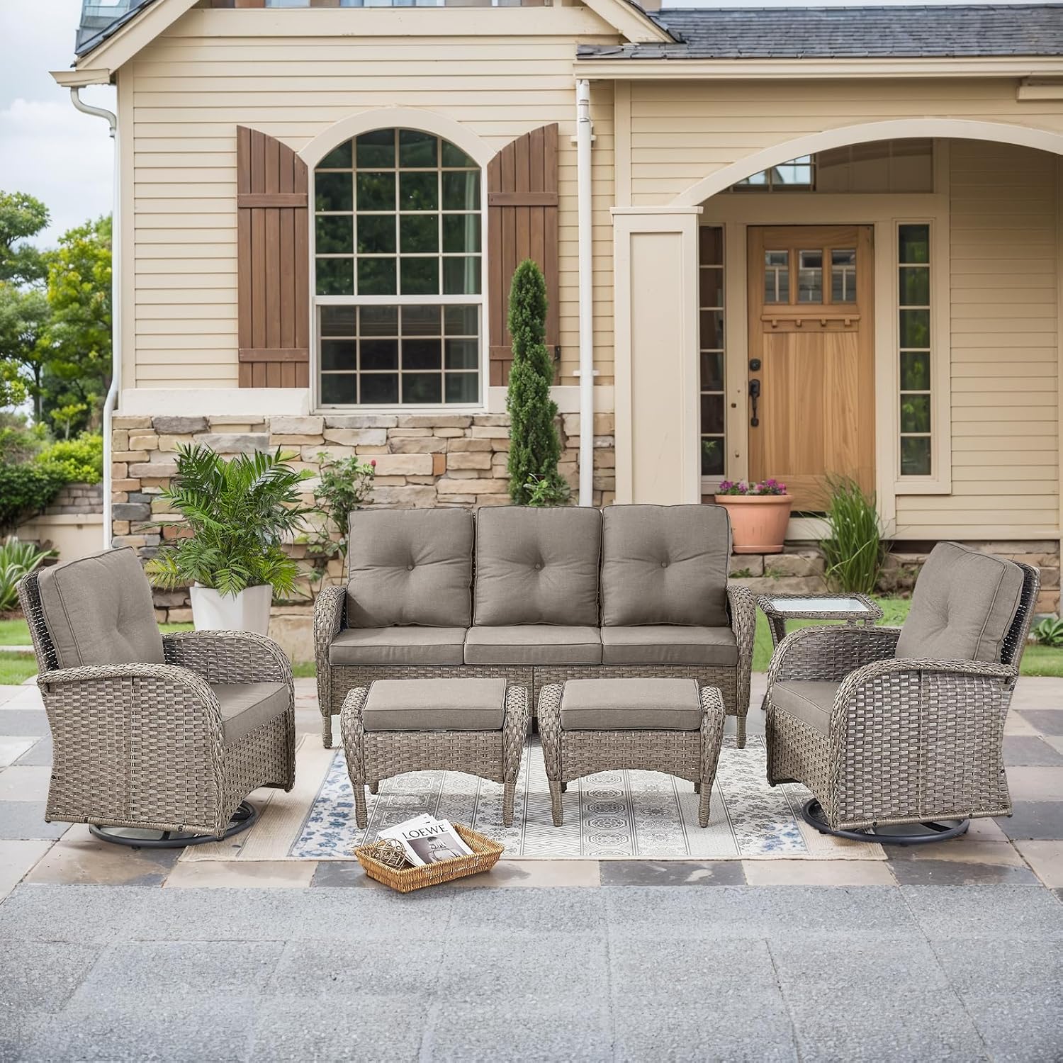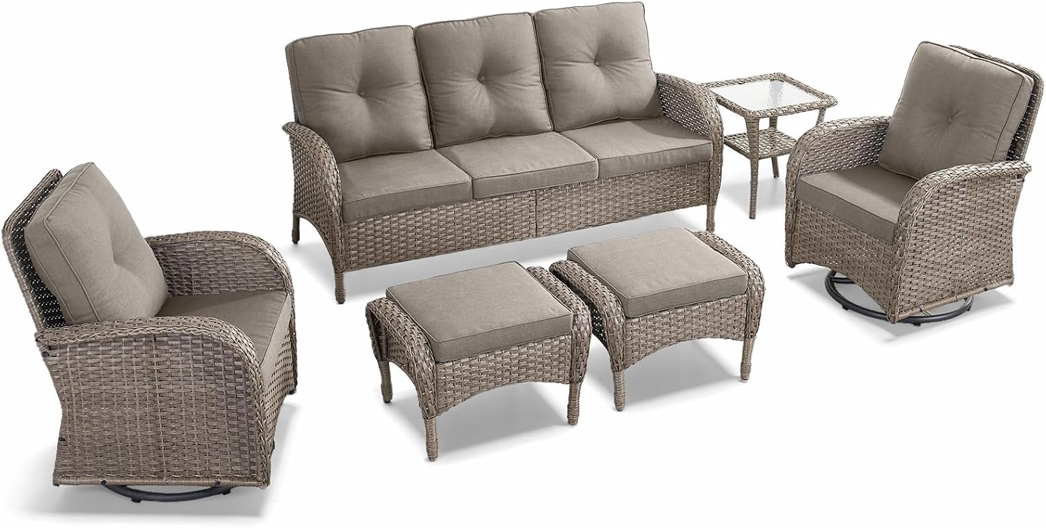 HUMMUH 6 Pieces Outdoor Patio Furniture-PE Rattan Wicker Sofa with Patio Swivel Rocking Chairs Patio Furniture for Deck Lawn Porch Balcony Poolside-Grey/Grey