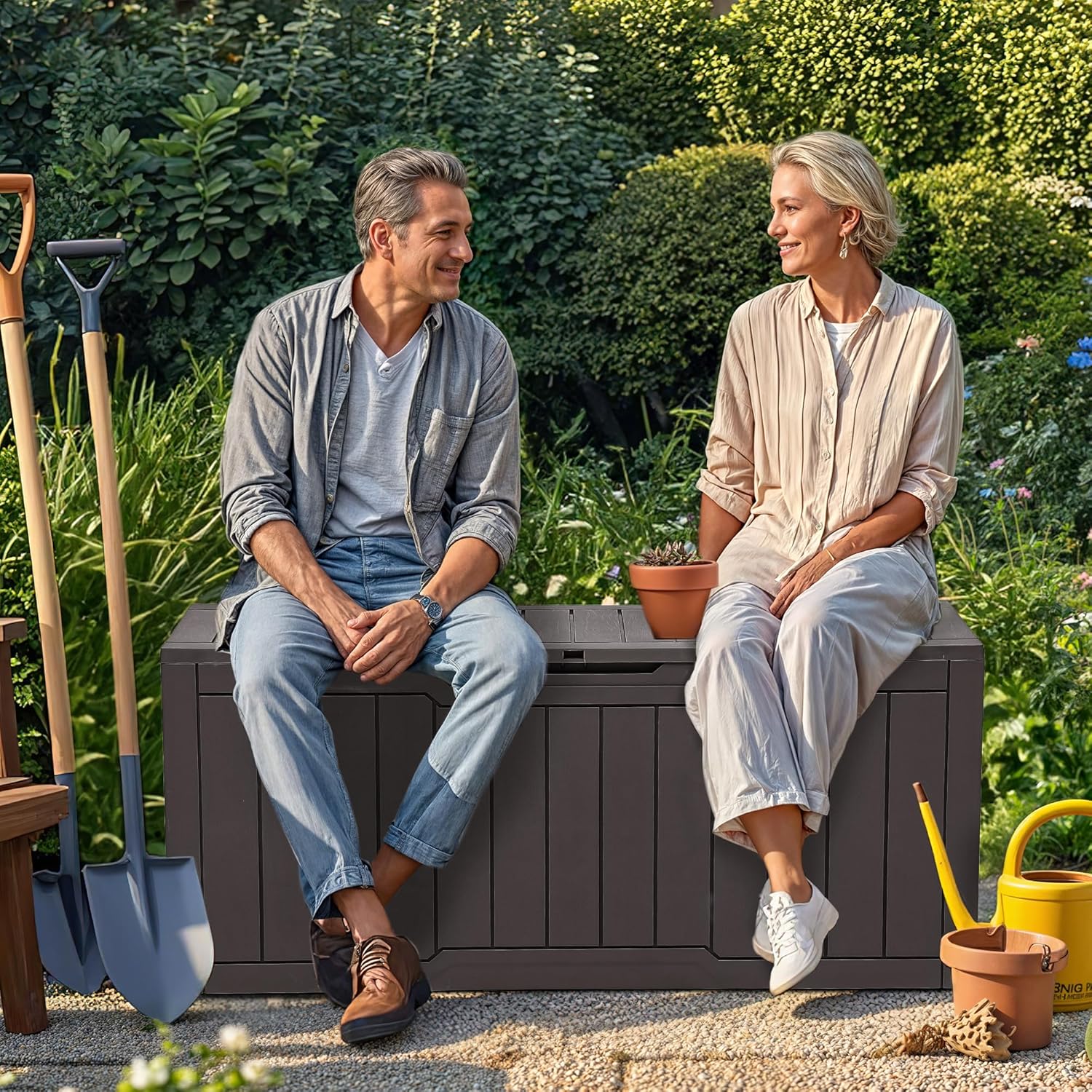- Extra Seating: Doubling as a comfortable bench seat, this plastic deck box can support up to 485 pounds; Set it up in just 15-30 minutes, and enjoy its unique wood-grain texture that seamlessly blends with any patio or deck decor in no time