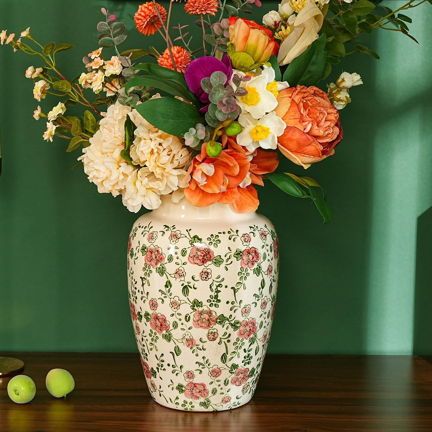 Sungmor Ceramic Flower Vase, Vintage Ice Cracked Glaze Porcelain Vase, Pretty Home Decor Vase for Flower Arrangement, Fresh Flowers, 10.2 Inch Tall Chinoiserie Pottery Vase, Pink Floral Pattern