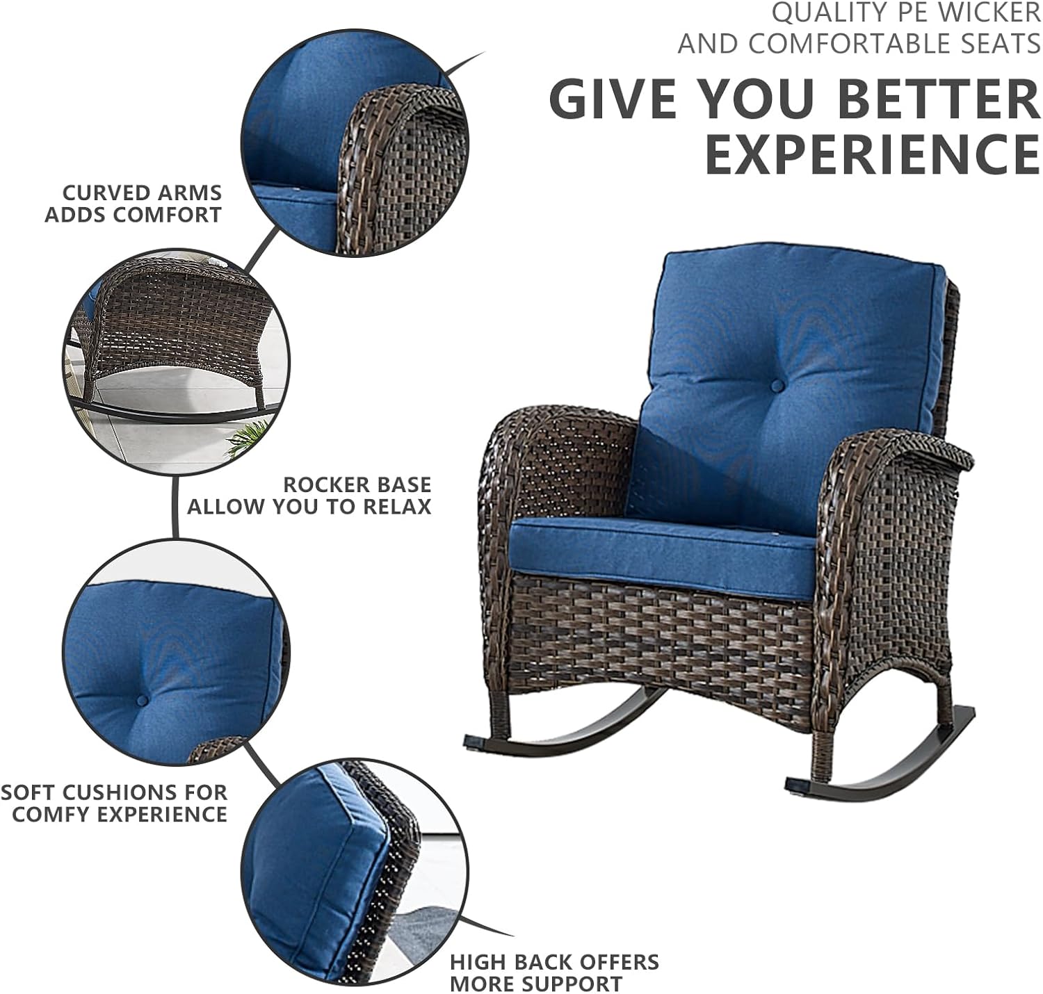 - Outdoor Rocking Chairs:Resting on chairs with sturdy round metal base allows to rock back and forth for relaxing, with seat and back cushions contribute to comfortable support, making the outdoor set a perfect addition to transform your patio.