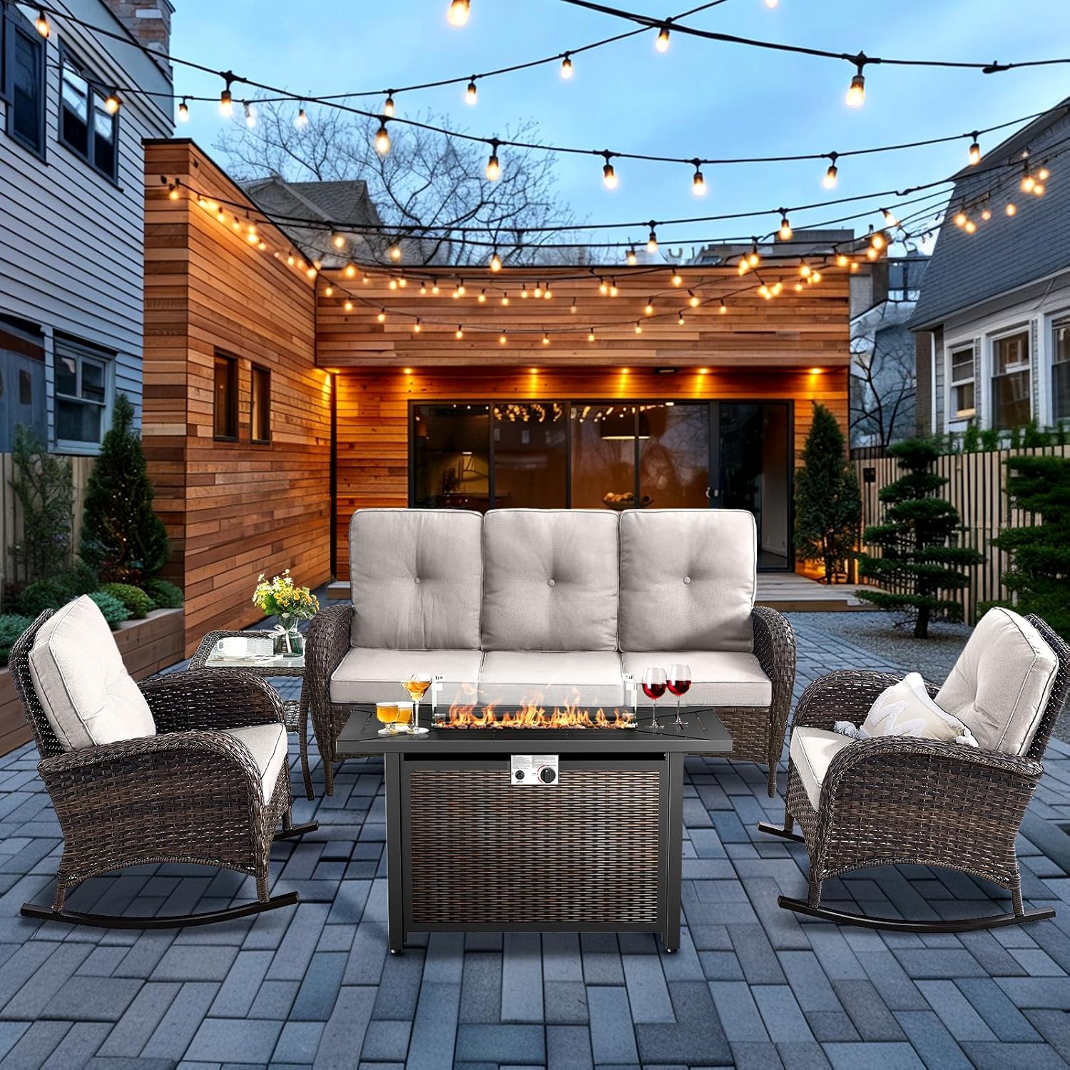 HUMMUH 5-Piece Patio Furniture Set with Fire Pit,Wicker Outdoor Rocking Chairs Patio Sofa for Backyard,Poolside,Deck