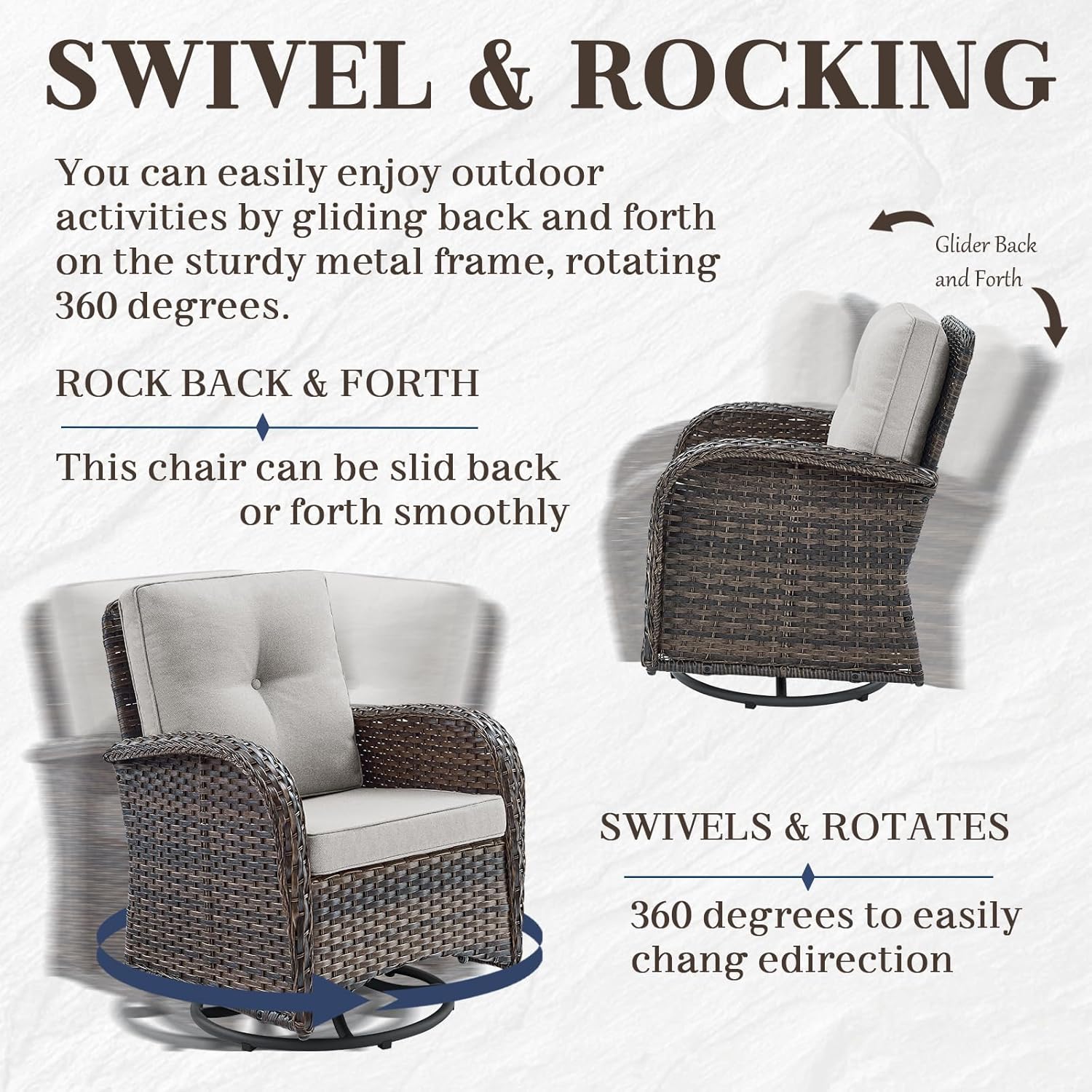 - Swivel Rocking Chairs:Resting on chairs with sturdy round metal base allows to glide gently and swivel 360° for relaxing, with seat and back cushions contribute to comfortable support, making the outdoor set a perfect addition to transform your patio.