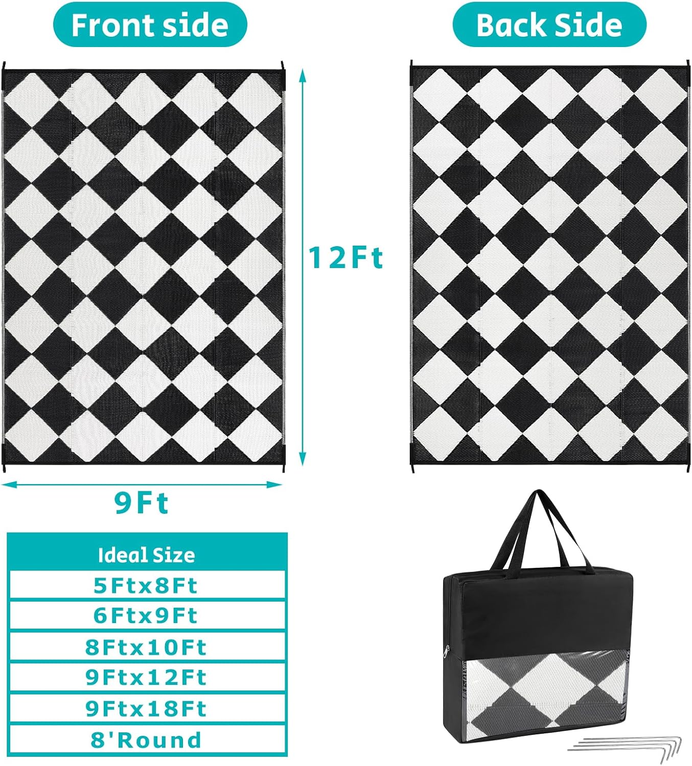 - Easy to Store & Portable Patio Mat: HEBE plastic woven indoor and outside rug is made of lightweight material. This portable waterproof outdoor rug are easy to transport for camping, beach trip, barbecue picnic or RV road trip.This camper rug also designed with 4 corner loops with 4 stakes to help fix the carpet in place for easy use.
