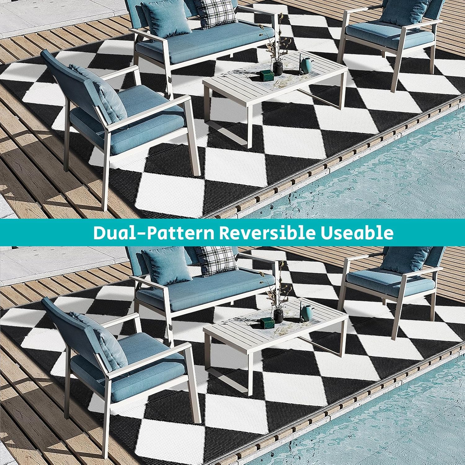 - Premium Material Outdoor Doormat: This reversible outdoor doormats are made from high quality recycled plastic straws and be woven tightly, durable enough, no fade, water resistant. It's soft and comfortable to walk on barefoot.Plus, the high-end UV coating and edge heat treatment technology prevent fading and sun damage without worrying about wear and tear.