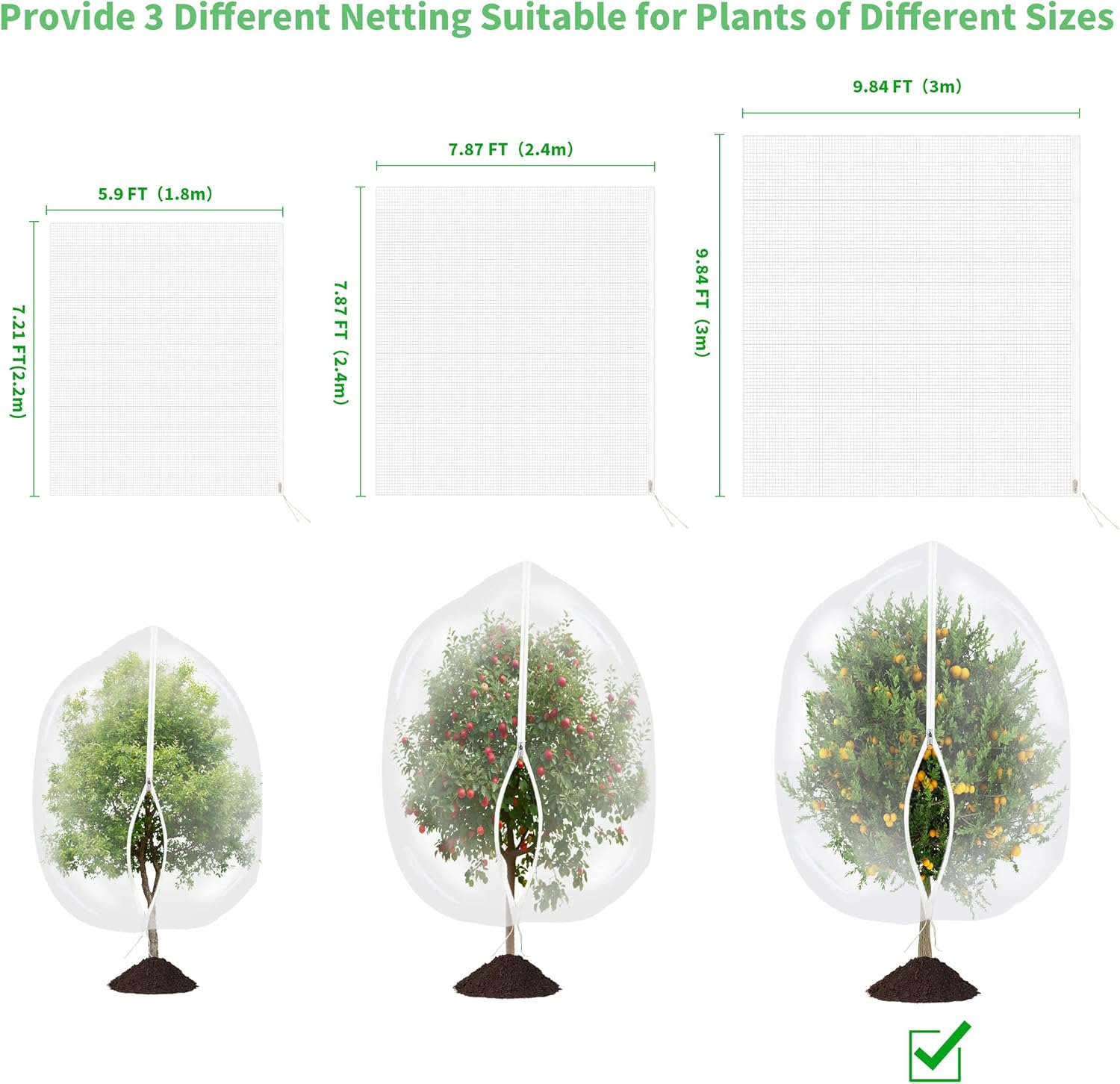 - Protect Your Harvest: Worry no more about wasted fruit with our bird netting! Effortlessly safeguard blueberry bushes, grapes, tomatoes, lemons, strawberries, oranges, and other fruit trees, vegetables, and shrubs from pesky insect, cicada, and bird damage.
