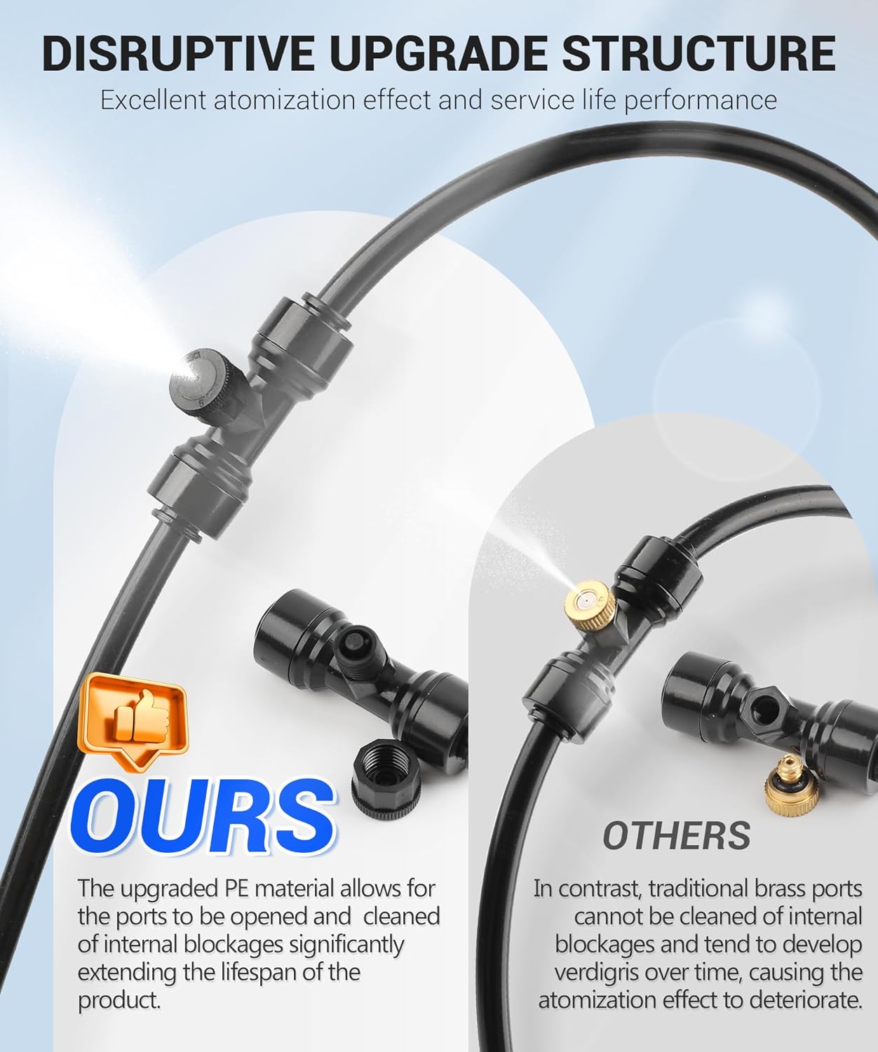 - 【High-Quality Misters for Outside Patio】The upgraded PE material allows for the ports to be opened and cleaned of internal blockages, and PE material ensures that the misting cooling system is resistant to corrosion, leakage, and sediment blockage caused by weather and usage conditions, giving the misting system the advantage of a long service life