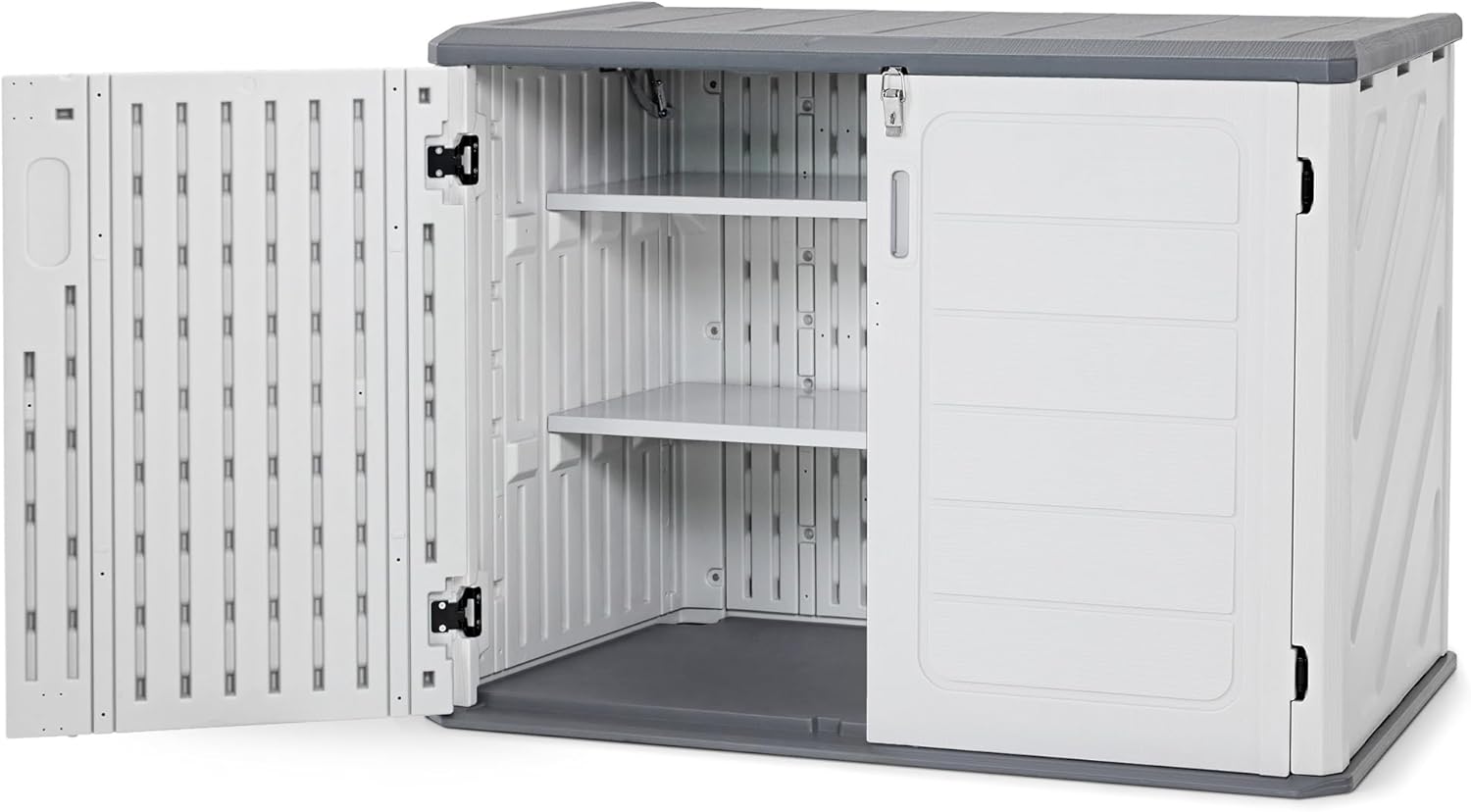 Macrout 25 Cu.Ft Small Plastic Outdoor Storage Cabinet with Shelves, 4.3 x 2.5 ft Waterproof Resin Outdoor Storage Shed with Floor, Lockable Horizontal Shed for Garden and Patio