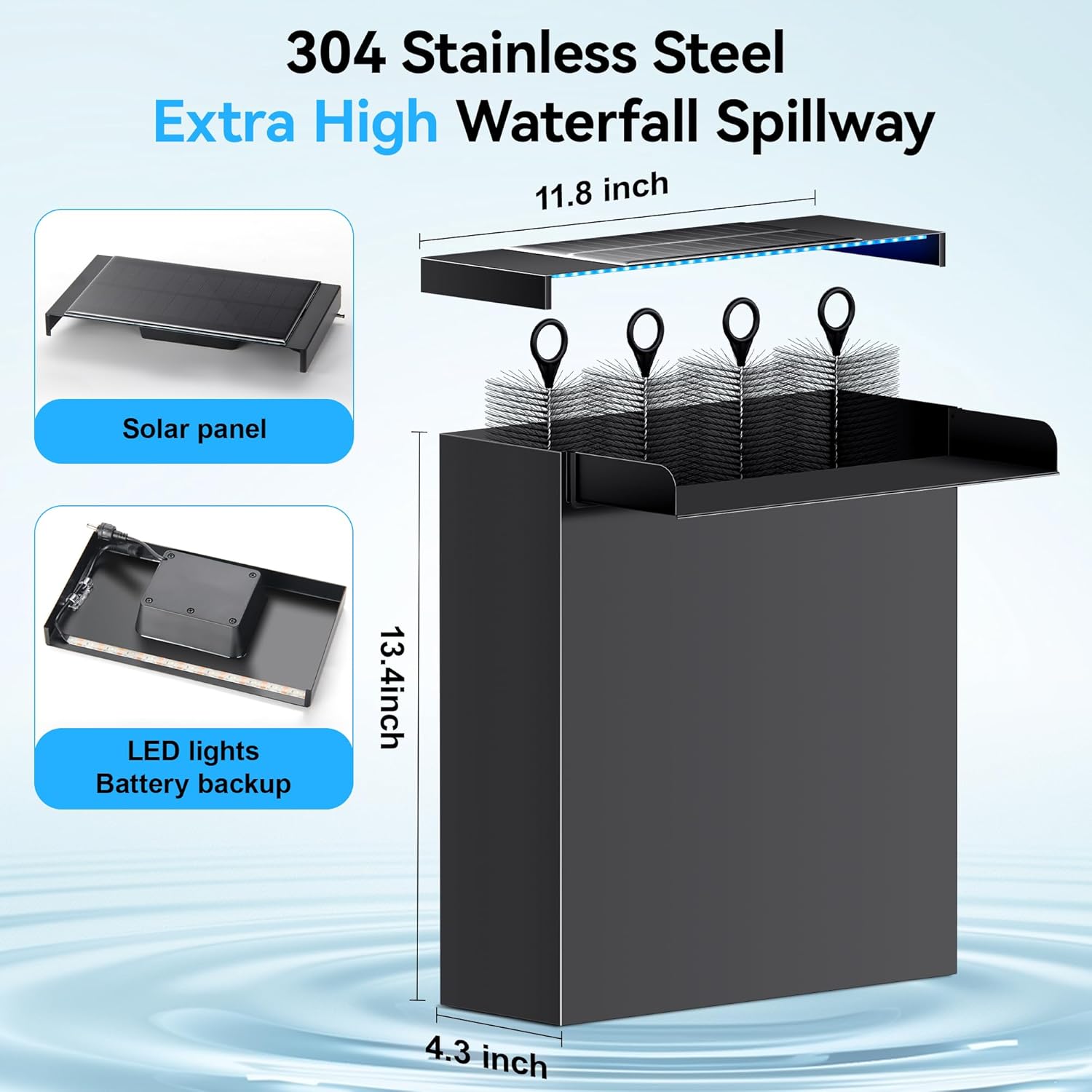 POPOSOAP Pond Waterfall Spillway Kit with LED Lights, 13.4" H x 12" W Stainless Steel Spillway with 660GPH Pond Pump, Filtration, 10FT Corrugated Tubing Waterfall for Water Garden, Backyard, Pool