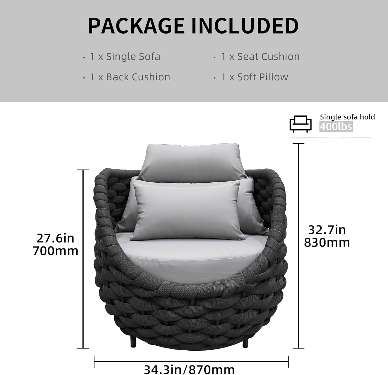 - Color : Textilene Dark Grey Rope W/Light Grey Cushion