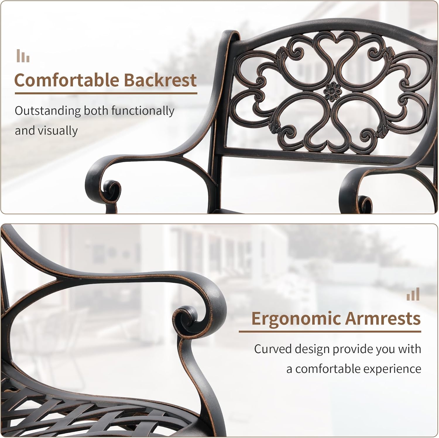 - Durable Cast Aluminum Material: Made of premium cast aluminum, our patio dining chairs ensure long-term durability without easy deformation or breakage. In addition, the rust-proof and weather-resistant coating makes the chair set available for outdoor use all year round. makes the chair set available for outdoor use all year round.