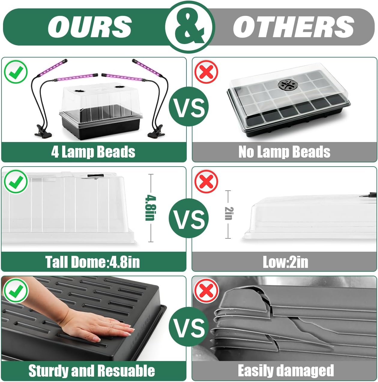 - 【Complete Indoor Seed Starter Kit with Grow Lights】Includes 4 durable seed trays with 5" tall humidity domes and 2 dual-head grow lights (4 heads total). Ideal for beginners and experienced gardeners to grow vegetables, herbs, or flowers indoors year-round. Everything you need to start seeds successfully in one easy-to-use set.