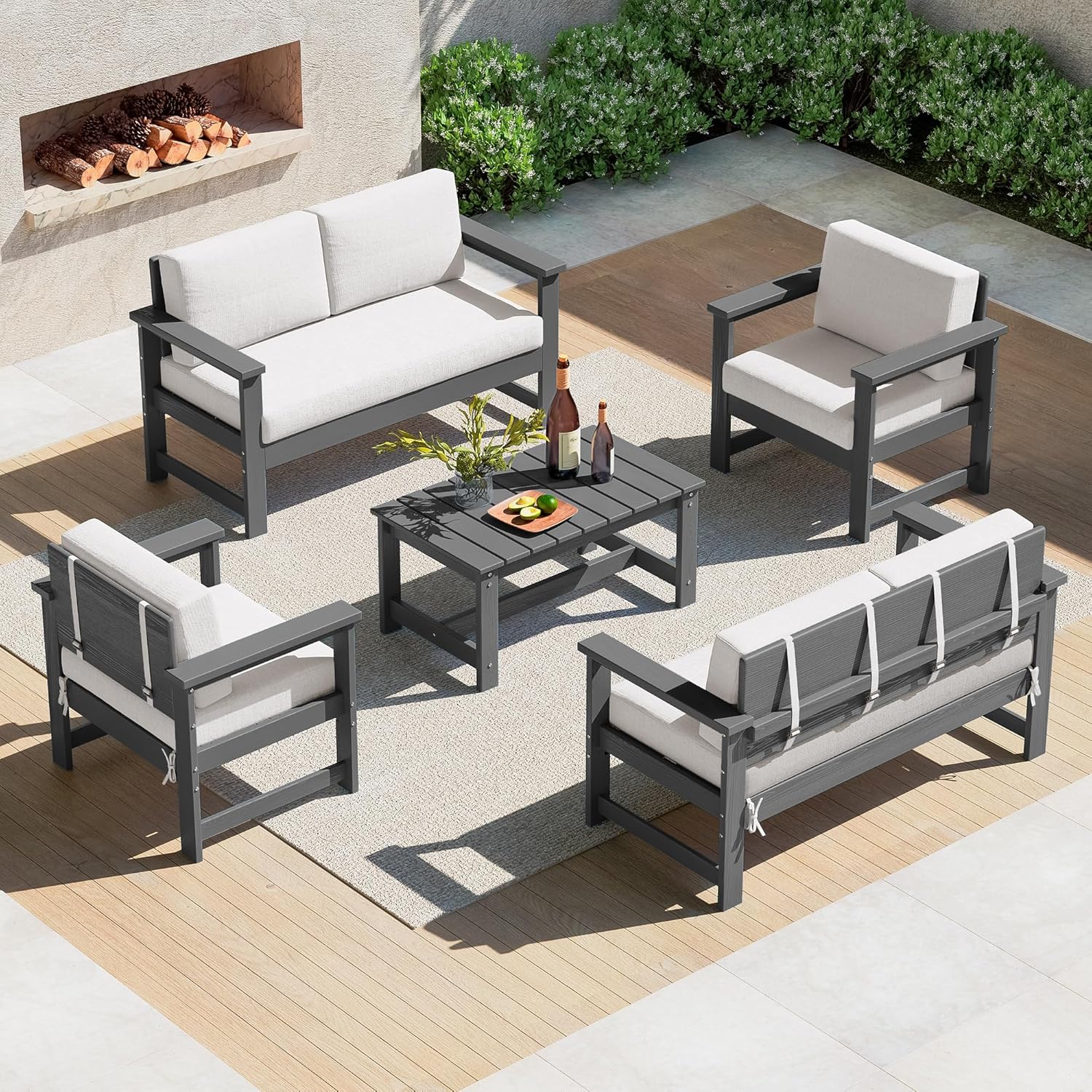 SERWALL 5 Pieces HDPE Outdoor Sofa Set with Cushions, All Weather Use Patio Conversation Couch Loveseat Furniture with Coffee Table for Balcony, Deck, Poolside, Grey Frame with Khaki Cushions