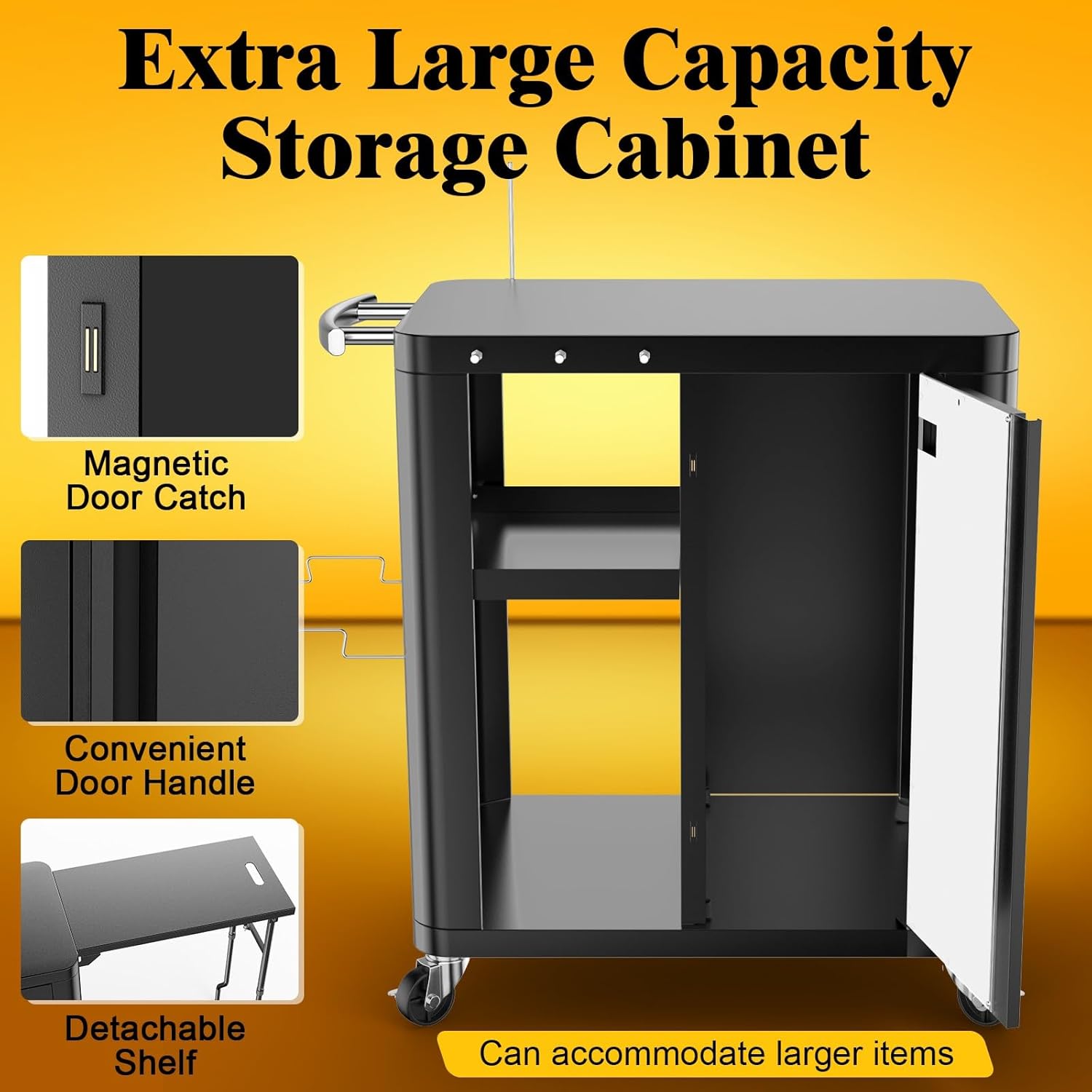 - 🔥Effortless Mobility: This grill cart moves smoothly on four heavy-duty swivel wheels with a large ergonomic handle for easy transport. Whether in the garden, kitchen, patio, or campsite, it rolls effortlessly to wherever you need it for cooking.