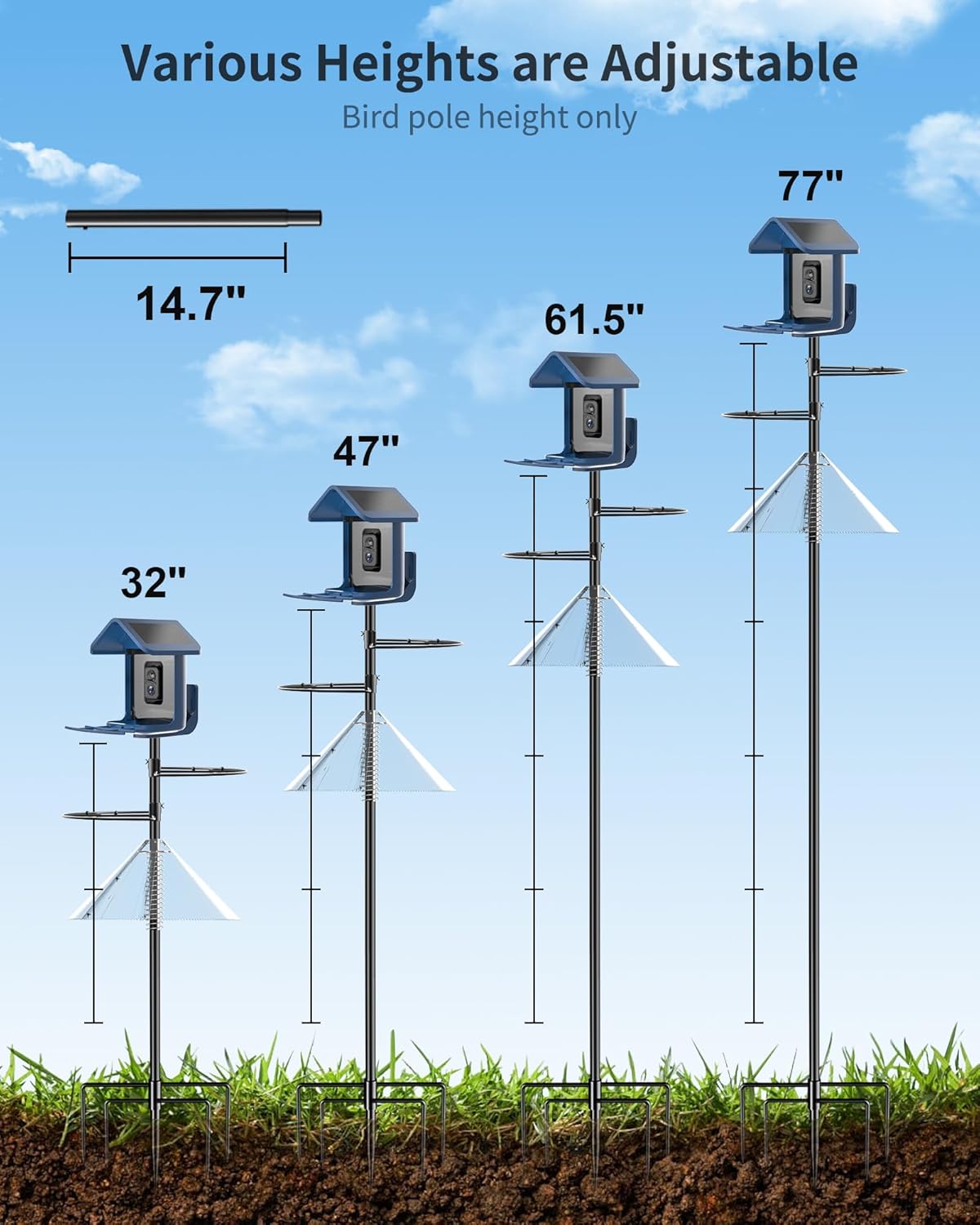 - ăEasy Installationă This 90 inch bird feeder stand includes 6.5-inch 5-prong bases, 6 connecting poles, an L-shaped plate, and a squirrel baffle. The slip-in connection makes assembly as easy as stacking blocks, while the wing nut design enables tool-free, adjust the baffle 8-10" above ground to stop squirrels, one-person setup in about 30 mins. This user-friendly design ensures everyone from young enthusiasts to seniors can assemble effortlessly.