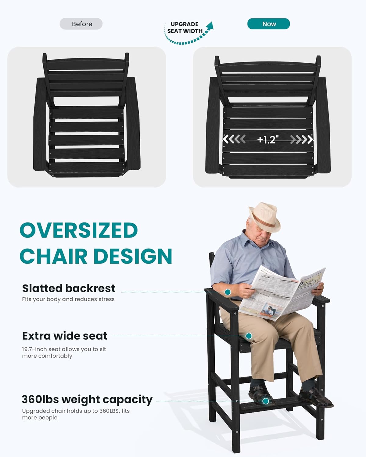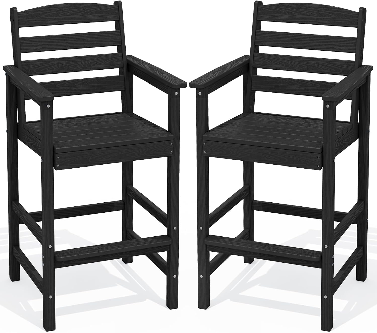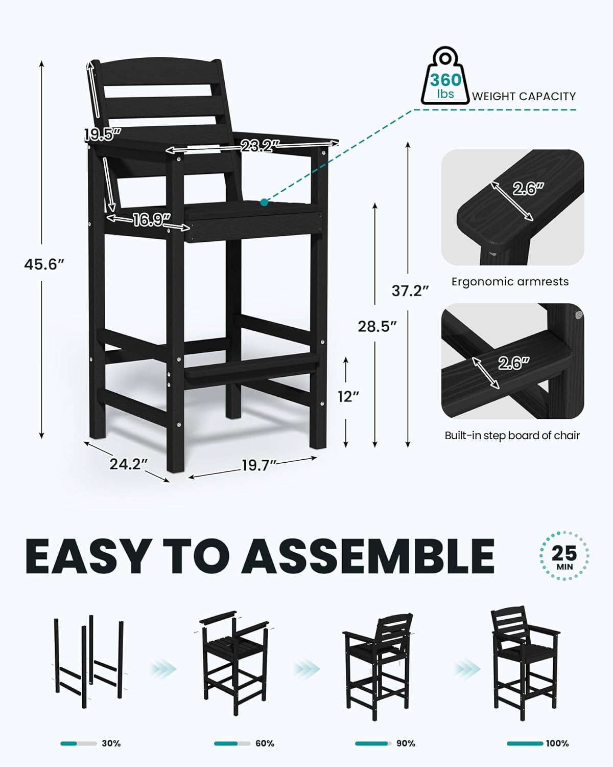 SERWALL Tall Adirondack Chairs Set of 2, Oversize Balcony Adirondack Chairs Set, Outdoor Bar Height Barstools Widened Chair Set for Bistro, Poolside, Garden, Black