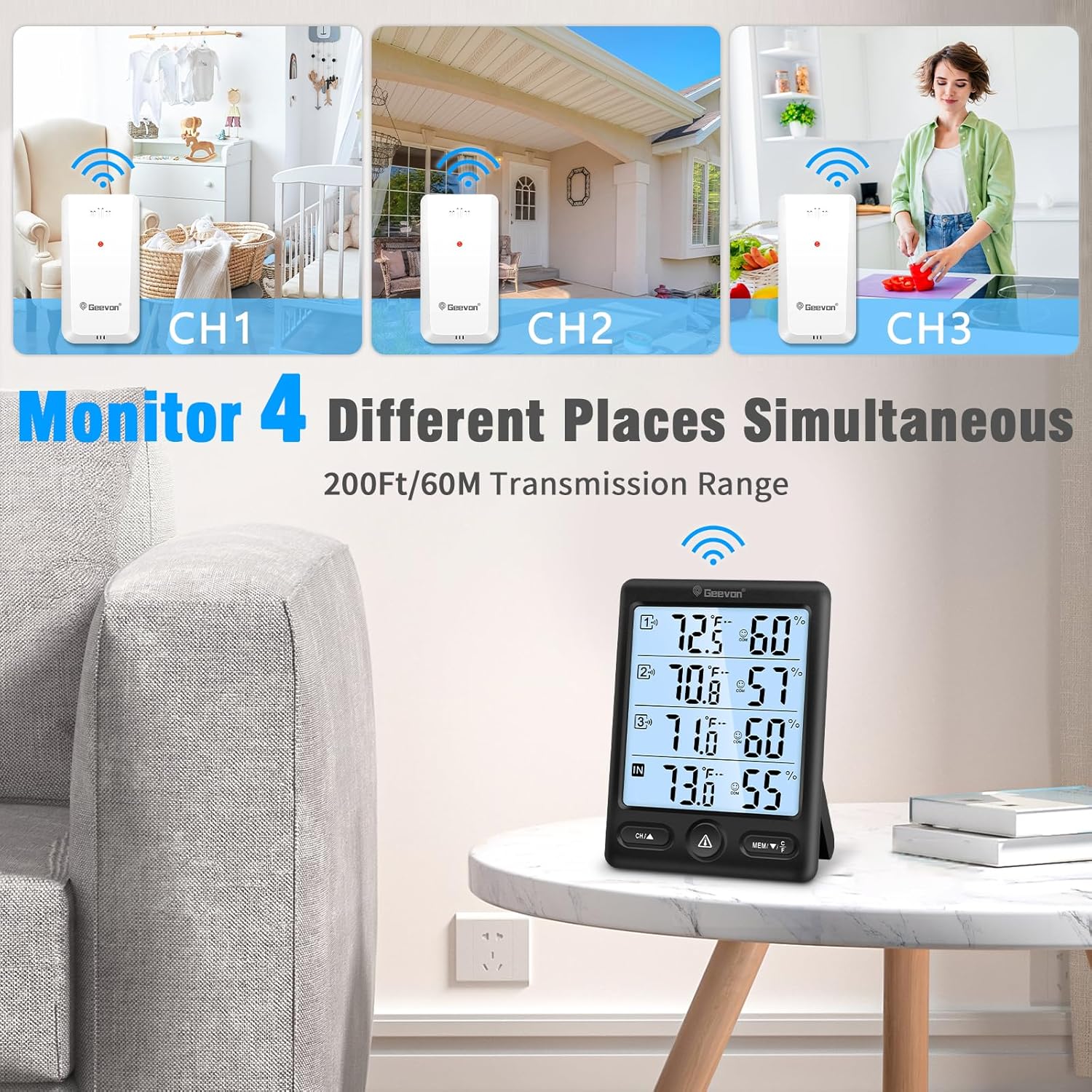 - 【Come with 3 Wireless Sensors】 Digital weather thermometer indoor outdoor with 3 remote sensors support to be connected to display readings from 4 different places simultaneously up to 200FT/60M apart (Wireless Frequency: 433 MHz). Monitor your whole home, basement, or greenhouse confidently with our digital temperature humidity gauge.