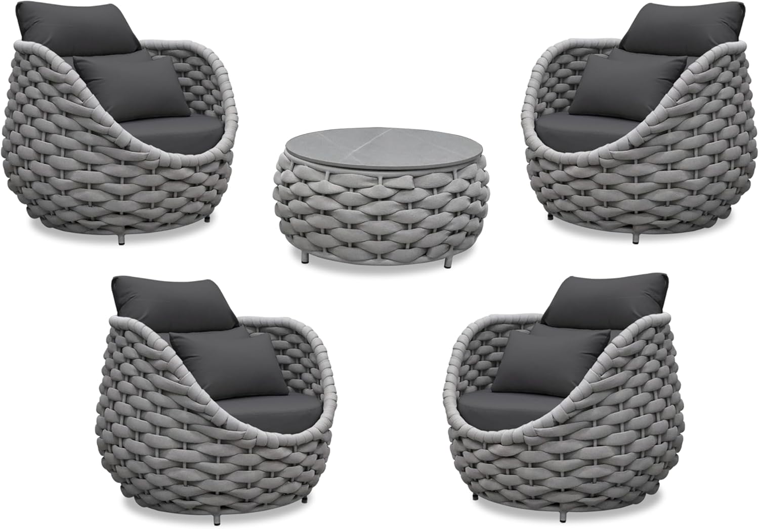 - Woven rope patio set includes: 4*sofa armchairs, 1*coffee table. Size: Single sofa: 34.3''(L)X34.3''(W)X27.6''(H) holds up to 400 lbs/181.5kg; Side table: 28.4''(L)X28.4''(W)X14.2''(H) holds up to 176 lbs/80kg. Color: Gray rope and dark gray fabric