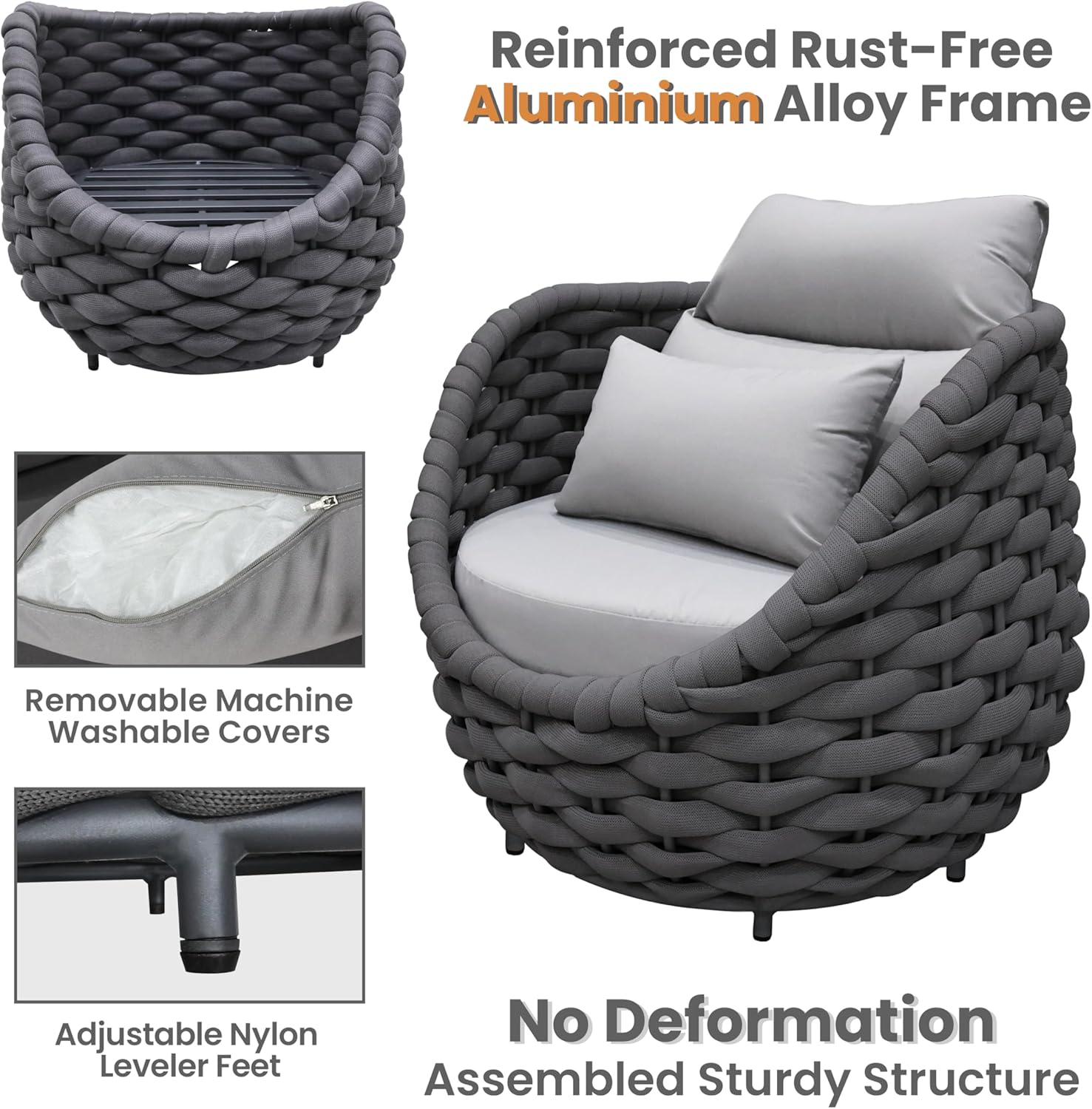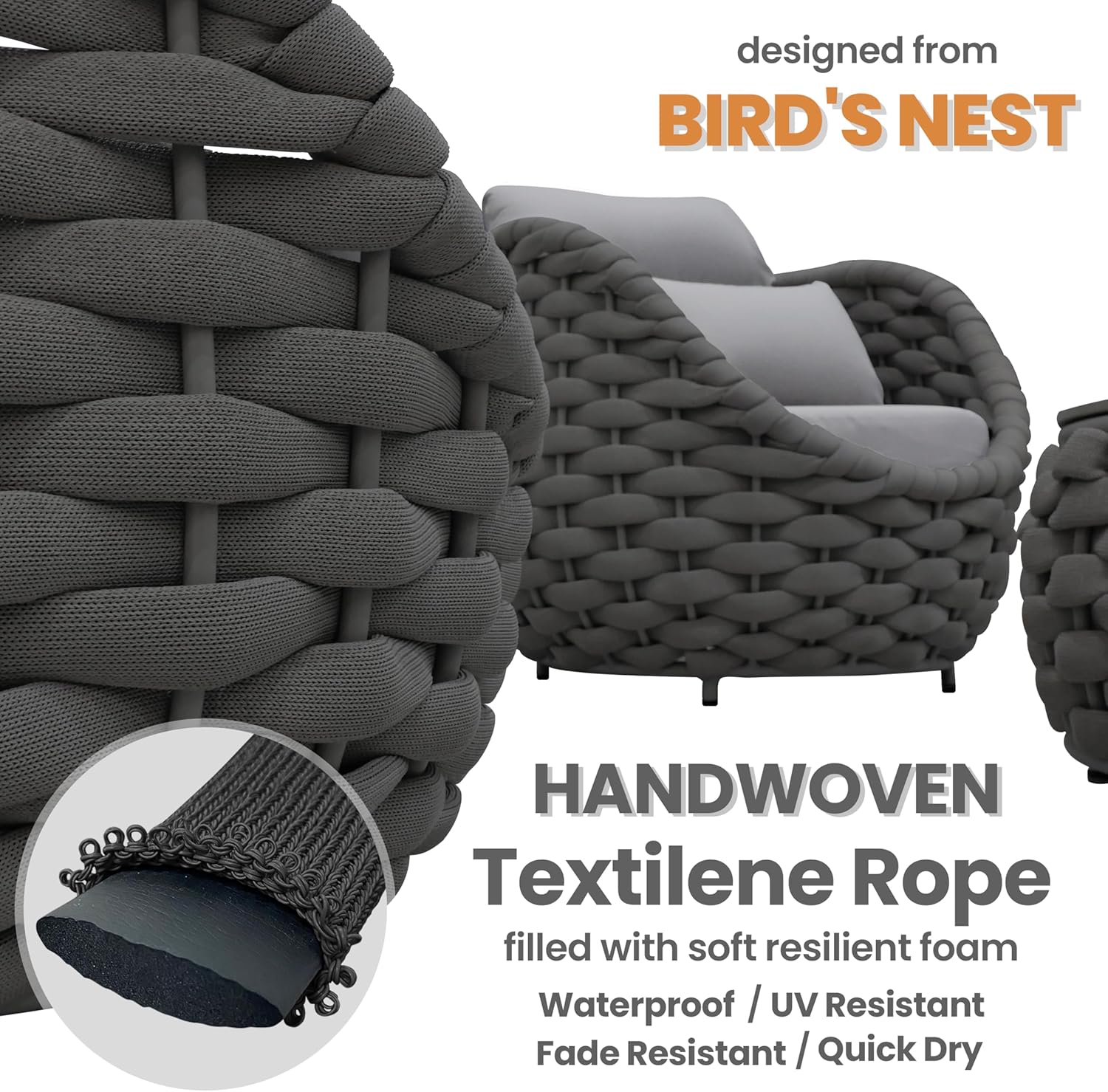 - Furniture set is crafted from reinforced rust-free aluminum alloy frame, wrapped in hand woven textilene rope. The 5 pieces all weather patio upholstered conversation set resists to UV, rain, wind, salt water. Perfect for indoor outdoor even arid or coastal areas