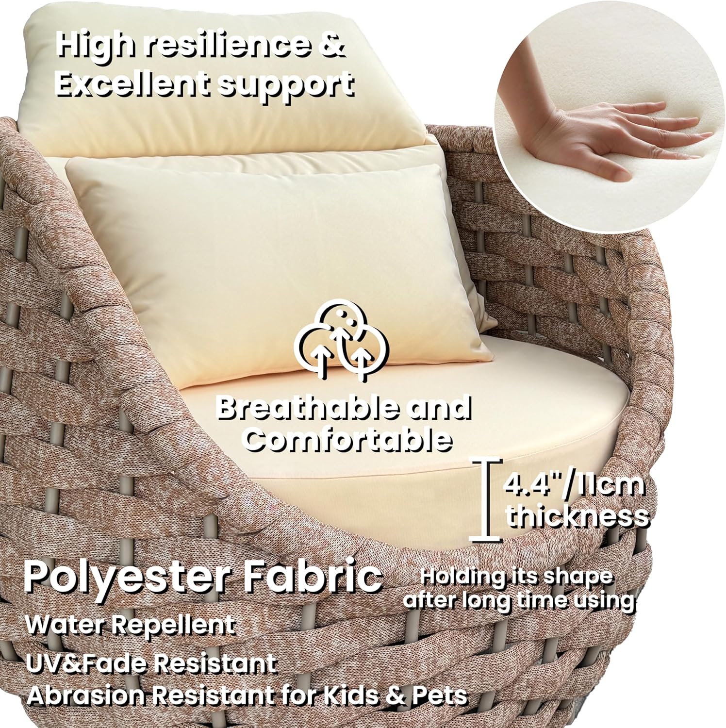 - Filled with 4.3"/11cm thick high-density sponge and cotton, cushions are soft touching and breathable for a refresh comfy patio seating holding its shape in long time using. Water repellent and abrasion resistant polyester fabric also fits families with kids and pets