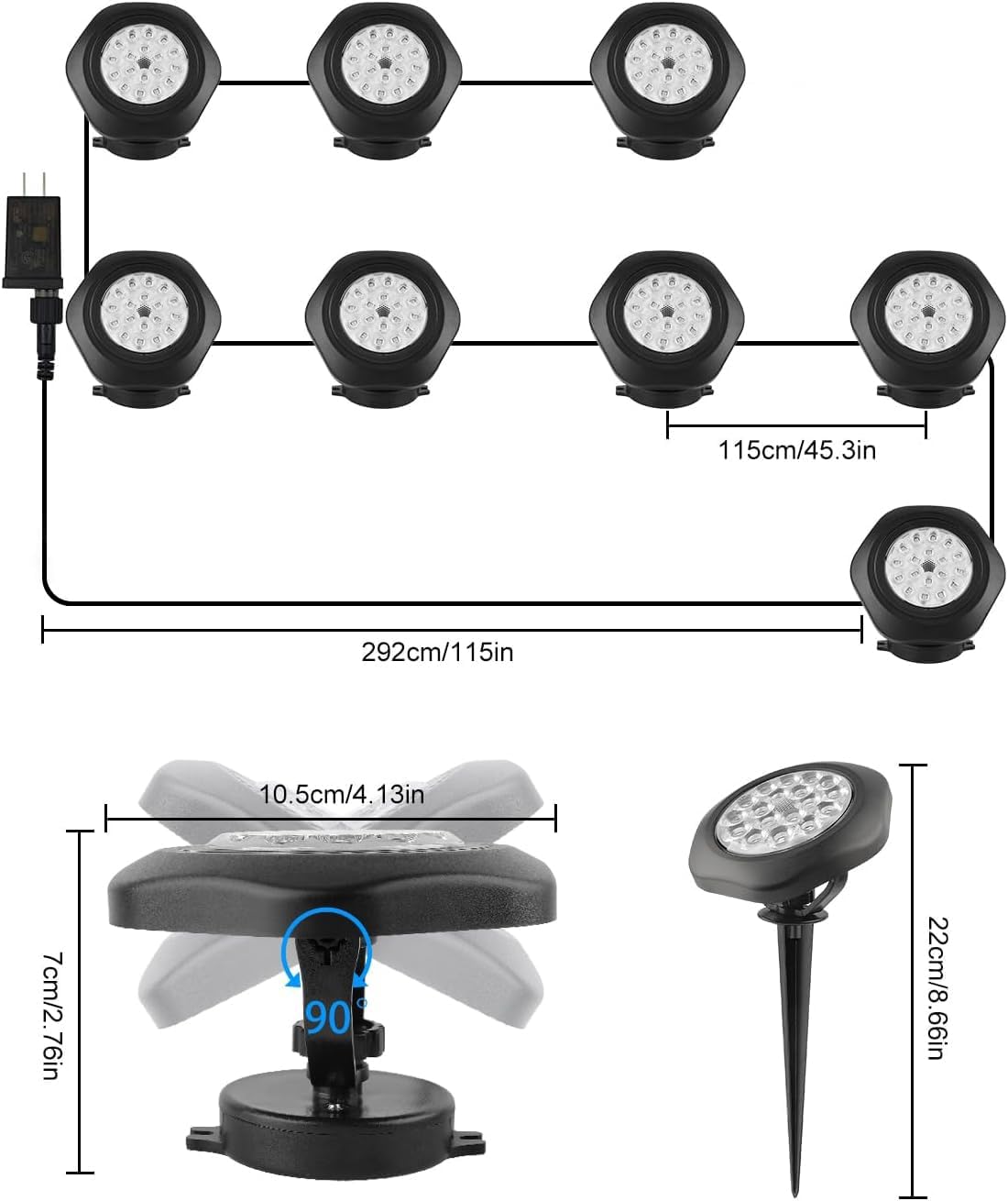 - Easy To Use & 2 In 1 Installation: LED underwater submersible light head can be adjusted 90°. There are 18 LED beads in one light, the super bright upgraded version is designed with a convex lens for brighter light. The distance from the plug to the first light is 9.8ft/3m, the distance between two lights is 3.2ft/1m. more flexible and convenient to use. Comes with matching accessories, the base can be fixed in the water as an underwater light, or can be installed on the ground or wall as a landscape light, both ways, suitable for pools, ponds, gardens, paths roads and other decorative lighting.
