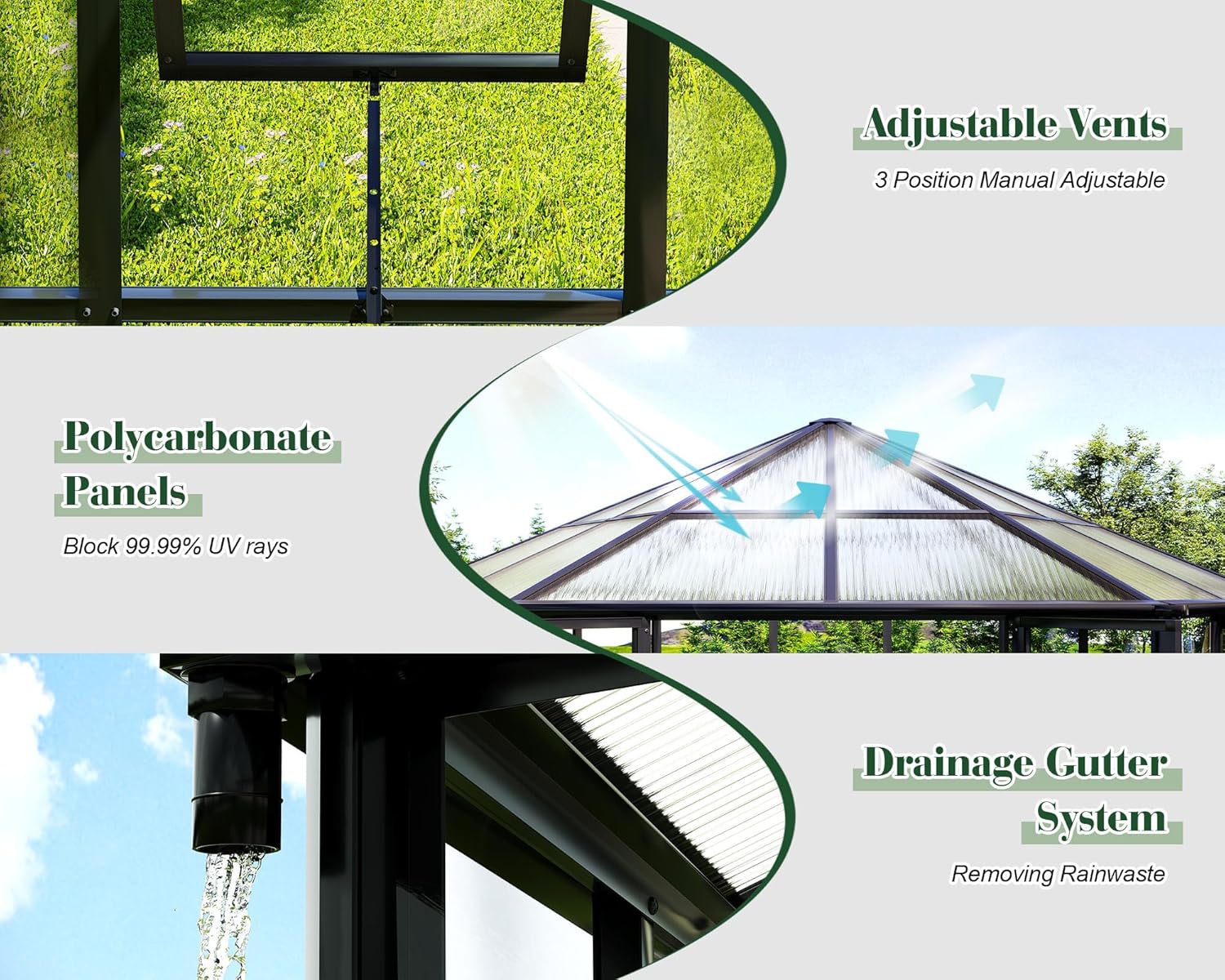 - Multifunctional Use: The adjustable vents promote airflow, while the translucent roof panels protect against harmful UV rays. A built-in gutter system ensures effective water drainage and collection