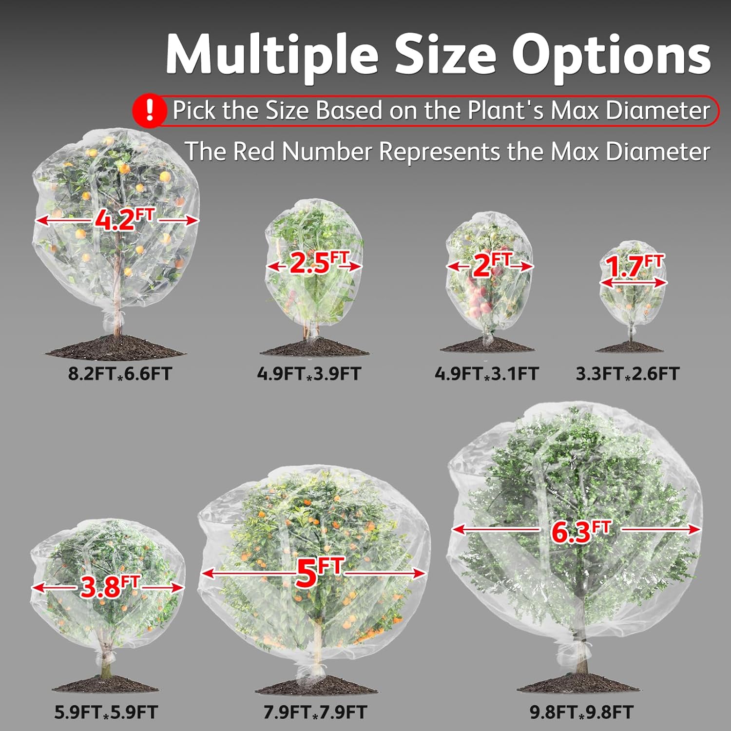 - JOJOLEE Garden Net Kit: This kit includes 2 packs of 9.8 ft(H) x 9.8 ft(W) garden net with a spread diameter of 6.26 ft. Before buying, please take the time to check the diameter and height of your plant to make sure the insect netting is sufficient to cover it.