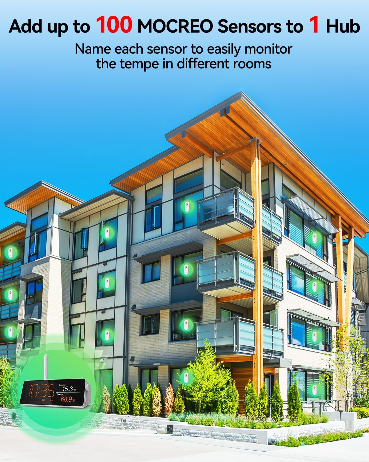 - 24/7 Remote Monitoring: The H5Pro Hub utilizes an extremely long-range wireless protocol to communicate with up to 100 sensors, at an open-air range of up to 1640ft (1/3 mile). The LCD display offers real-time monitoring, making it a comprehensive dashboard for historical data review, alarms, clock, weather, and calendar updates (Only supports 2.4 GHz WiFi)