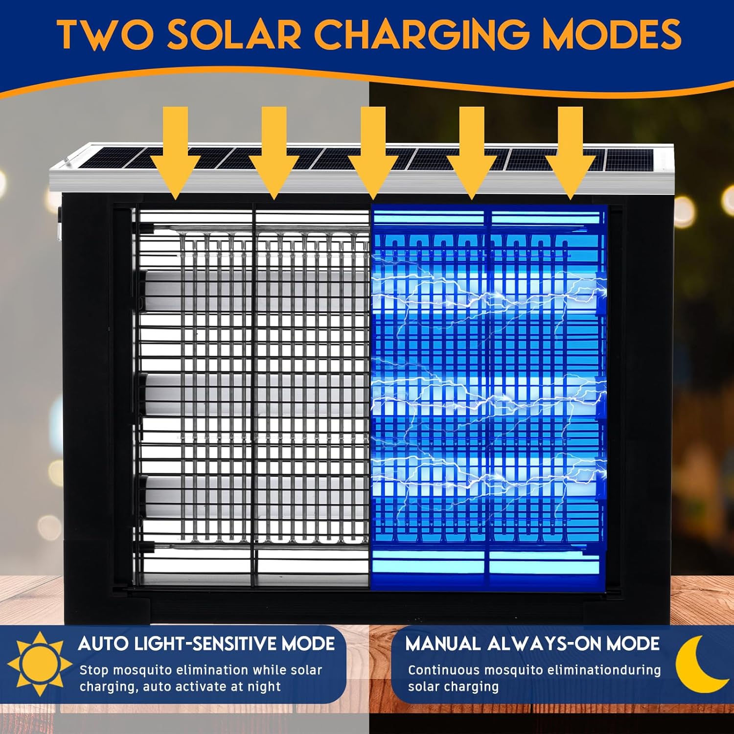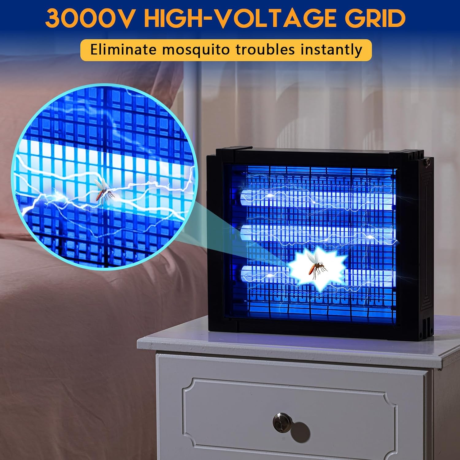 - High Performing 3000V Device: the mosquito zapper comes with a 3000V high-voltage grid; The bright blue-purple light emitted by the device instantly attracts mosquitoes and other flying insects; It provides a safe solution to keep your environment bug-free