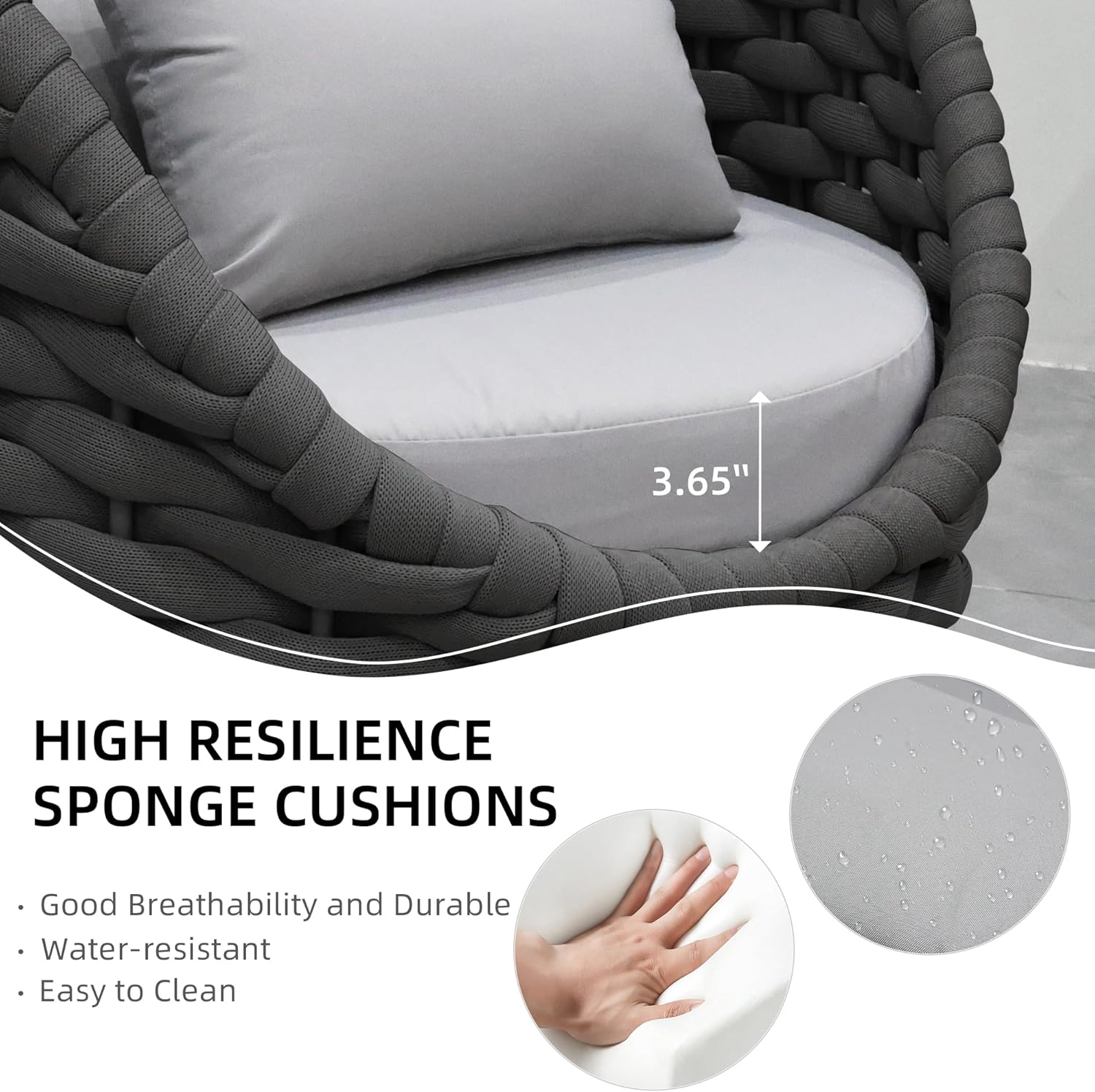 - Soft and Comfortable - Covering the top of the outdoor patio furniture baseplate, thicked cushions provide 4-inch padding as you sit. Thickened at the waist, the foam-filled cushions encourage proper posture while you sit. Each cushion of the outdoor patio set is wrapped in water-resistant and UV-protective polyester fabric. The seat cushion is equipped with an invisible zipper, which is not only beautiful but also can be easily removed for washing. No need to worry about pets scratching covers