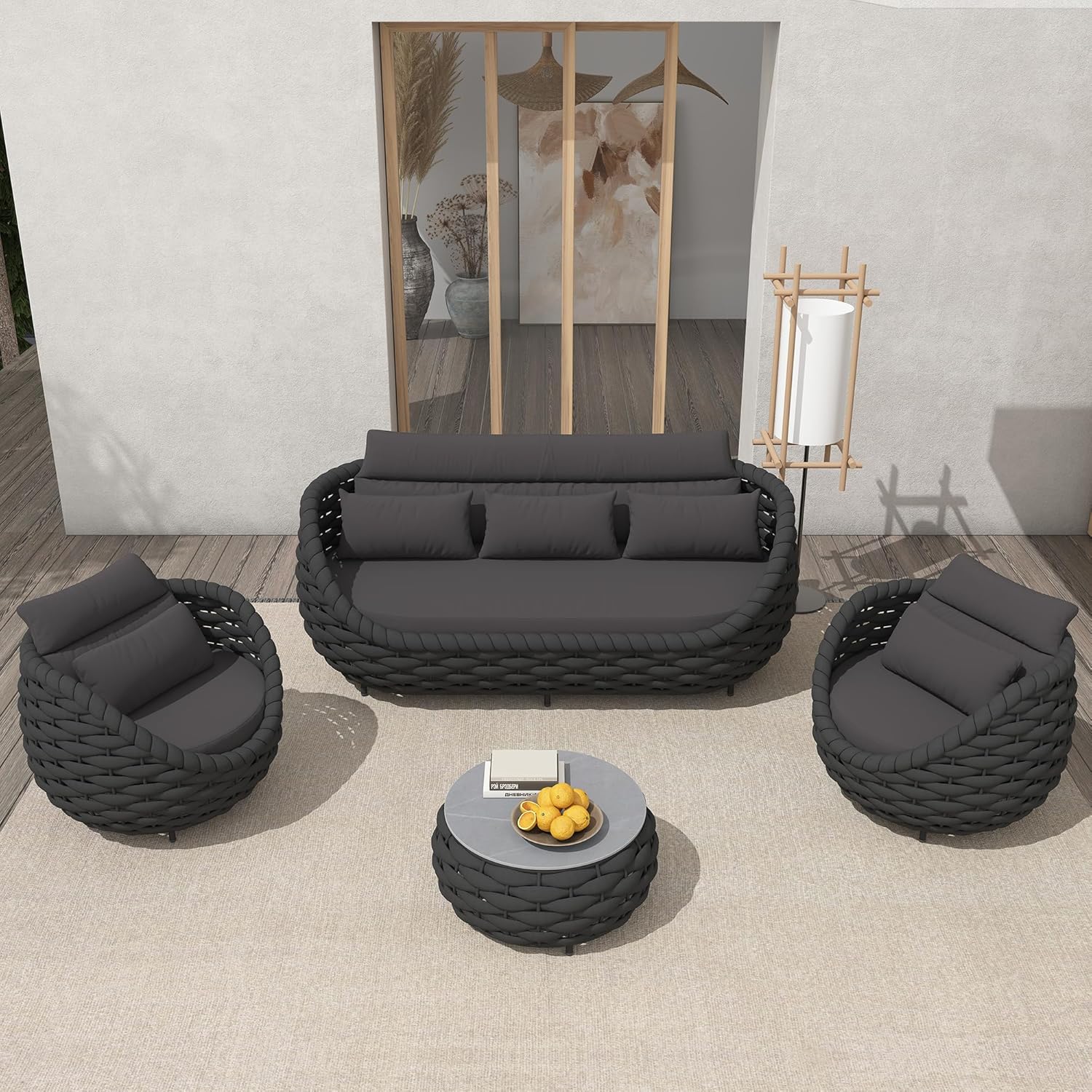 - ăUnique DesignăThe distinctive characteristic of this outdoor couch is the spherical and curving base,which necessitates highly expert artisans to weave. The sturdy curved armrest and backrest are designed for better upper-body support. The wide baseplate thatâs tightly lined up and the reinforced legs of the outdoor seating ensure sturdy construction and a large capacity that goes as high as 400LBS per seat.