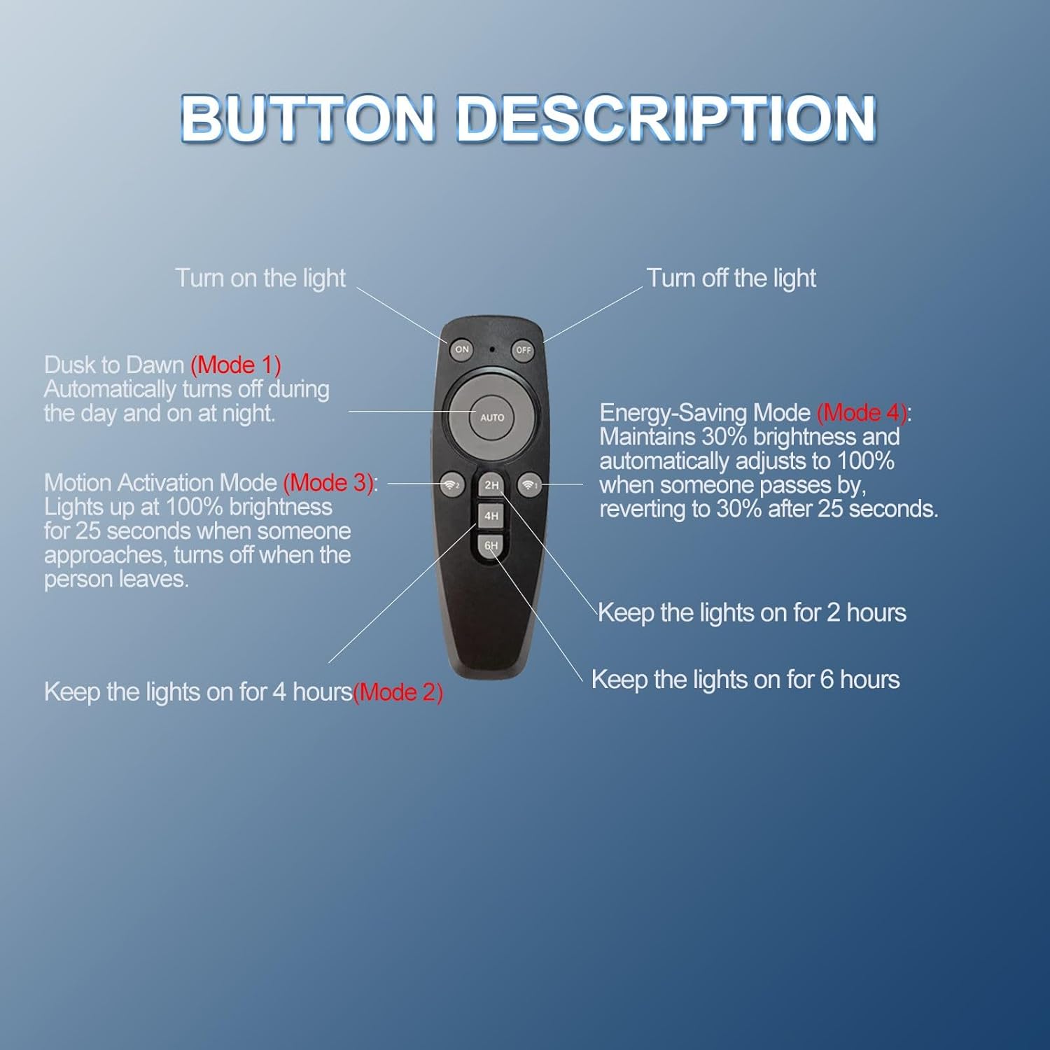 - 【4 Lighting Modes & Smart Control】 This solar light comes with a remote control. Mode 1 (press AUTO button): Dusk to Dawn – Automatically turns off during the day and on at night. Mode 2 (press 2H/4H/6H button): Timer Setting – Operates at full brightness for 2/4/6 hours before shutting off. Mode 3 (press WIFI logo 2): Motion Sensing – Lights up at 100% brightness for 25 seconds when someone approaches, turns off when the person leaves. Mode 4 (press WIFI logo 1): Energy-Saving – Maintains 30% brightness and automatically adjusts to 100% when someone passes by, reverting to 30% after 25 seconds. ( When you turn on the light and don't select a mode, it will default to Energy-Saving mode )