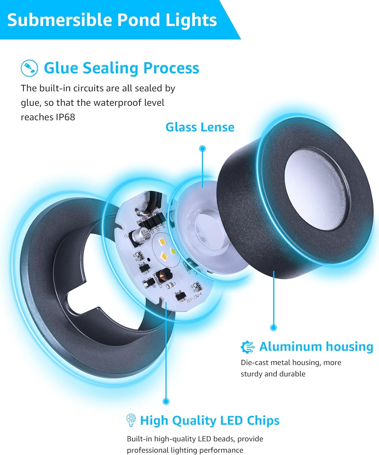 - 【Bright Pond Lights】- Professional quality submersible 3W LED lights are made of a die-cast metal housing and are equipped with superior LED chips that provide 300 lumens, equivalent to a 40W halogen bulb and saving up to 80% of power. 3000K soft warm white light, illuminate your pond, fountain, waterfall or traditional garden landscape with a beautiful and warm glow.